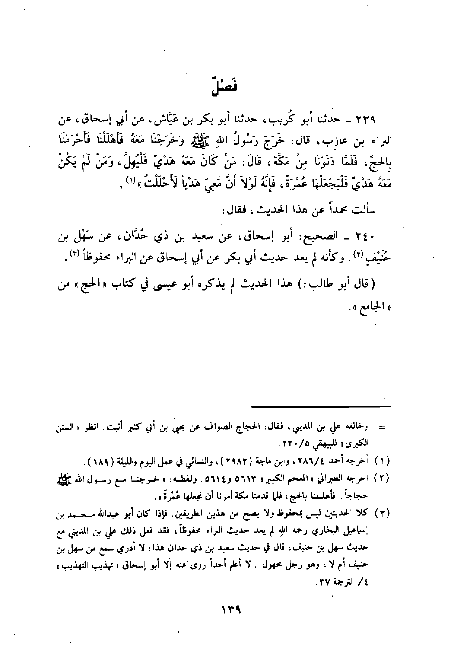 240 - الصَّحِيحُ أَبُو إِسْحَاقَ , عَنْ سَعِيدِ بْنِ ذِي حُدَّانَ , عَنْ سَهْلِ بْنِ حُنَيْفٍ , وَكَأَنَّهُ , لَمْ يَعُدَّ حَدِيثَ أَبِي بَكْرٍ عَنْ أَبِي إِسْحَاقَ , عَنِ الْبَرَاءِ , مَحْفُوظًا , قَالَ أَبُو طَالِبٍ: هَذَا الْحَدِيثُ لَمْ يَذْكُرْهُ أَبُو عِيسَى فِي كِتَابِ الْحَجِّ مِنَ الْجَامِعِ