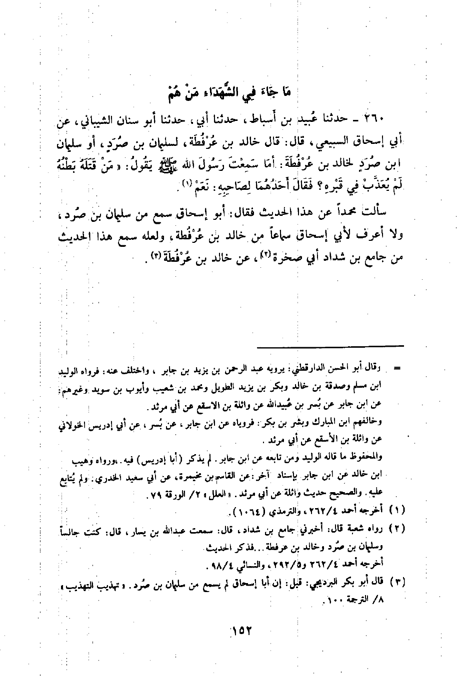 260 - حَدَّثَنَا عُبَيْدُ بْنُ أَسْبَاطِ , حَدَّثَنَا أَبِي , حَدَّثَنَا أَبُو سِنَانٍ الشَّيْبَانِيُّ , عَنْ أَبِي إِسْحَاقَ السَّبِيعِيِّ , قَالَ: قَالَ خَالِدُ بْنُ عُرْفُطَةَ لِسُلَيْمَانَ بْنَ صُرَدٍ أَوْ سُلَيْمَانَ بْنِ صُرَدٍ لِخَالِدِ بْنِ عُرْفُطَةَ: أَمَا سَمِعْتَ رَسُولَ اللَّهِ صَلَّى اللهُ عَلَيْهِ وَسَلَّمَ يَقُولُ: «§مَنْ قَتَلَهُ بَطْنُهُ لَمْ يُعَذَّبْ فِي قَبْرِهِ» فَقَالَ أَحَدُهُمَا لِصَاحِبِهِ: نَعَمْ. سَأَلْتُ مُحَمَّدًا عَنْ هَذَا الْحَدِيثِ فَقَالَ: أَبُو إِسْحَاقَ سَمِعَ مِنَ سُلَيْمَانَ بْنِ صُرَدٍ , وَلَا أَعْرِفُ لِأَبِي إِسْحَاقَ سَمَاعًا مِنْ خَالِدِ بْنِ عُرْفُطَةَ , وَلَعَلَّهُ سَمِعَ هَذَا الْحَدِيثَ مِنْ جَامِعِ بْنِ شَدَّادٍ أَبِي صَخْرَةَ , عَنْ خَالِدِ بْنِ عُرْفُطَةَ