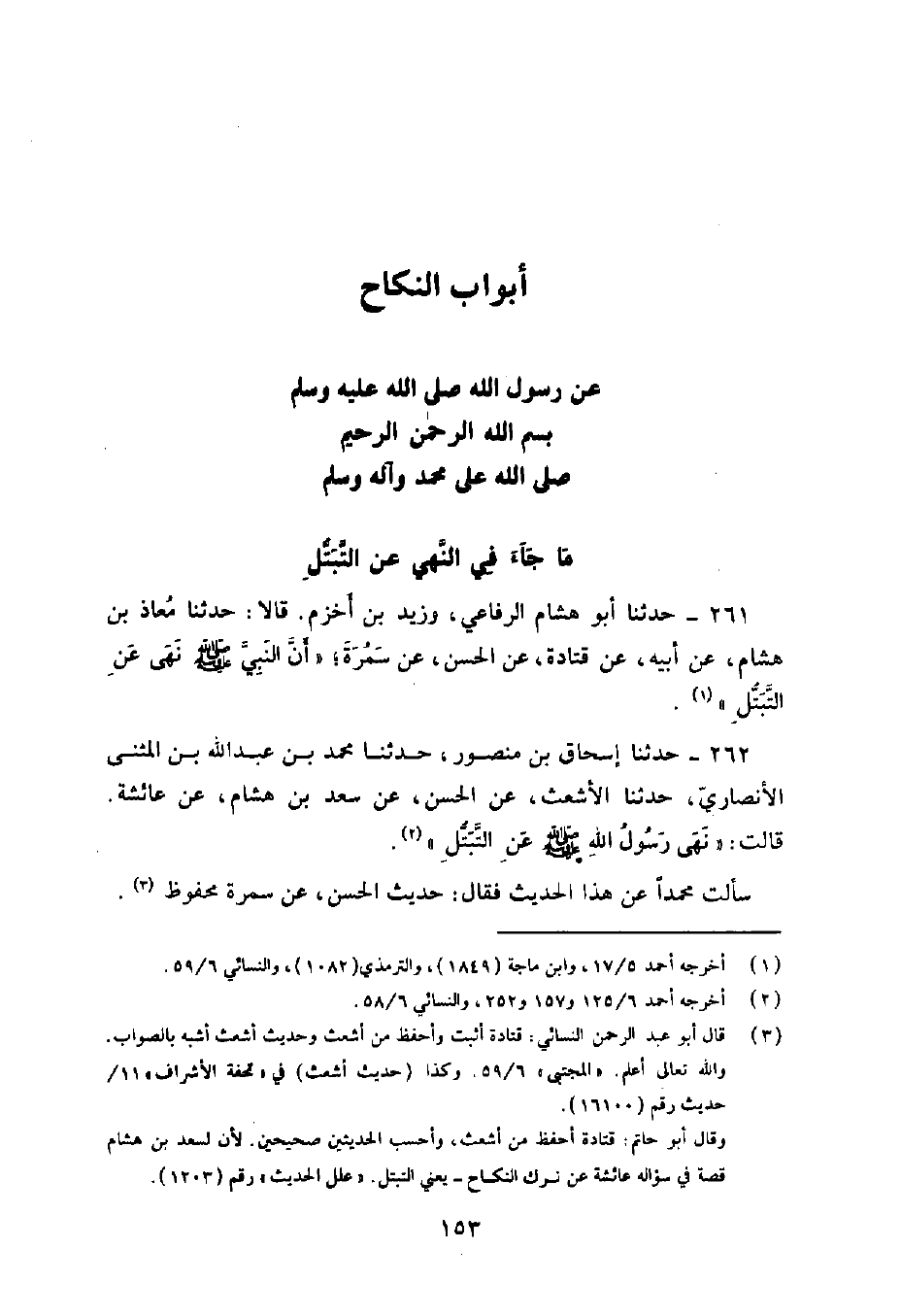 261 - حَدَّثَنَا أَبُو هِشَامٍ الرِّفَاعِيُّ , وَزَيْدُ بْنُ أَخْزَمَ , قَالَا: حَدَّثَنَا مُعَاذُ بْنُ هِشَامٍ , عَنْ أَبِيهِ , عَنْ قَتَادَةَ , عَنِ الْحَسَنِ , عَنْ سَمُرَةَ , أَنَّ §النَّبِيَّ صَلَّى اللهُ عَلَيْهِ وَسَلَّمَ نَهَى عَنِ التَّبَتُّلِ "