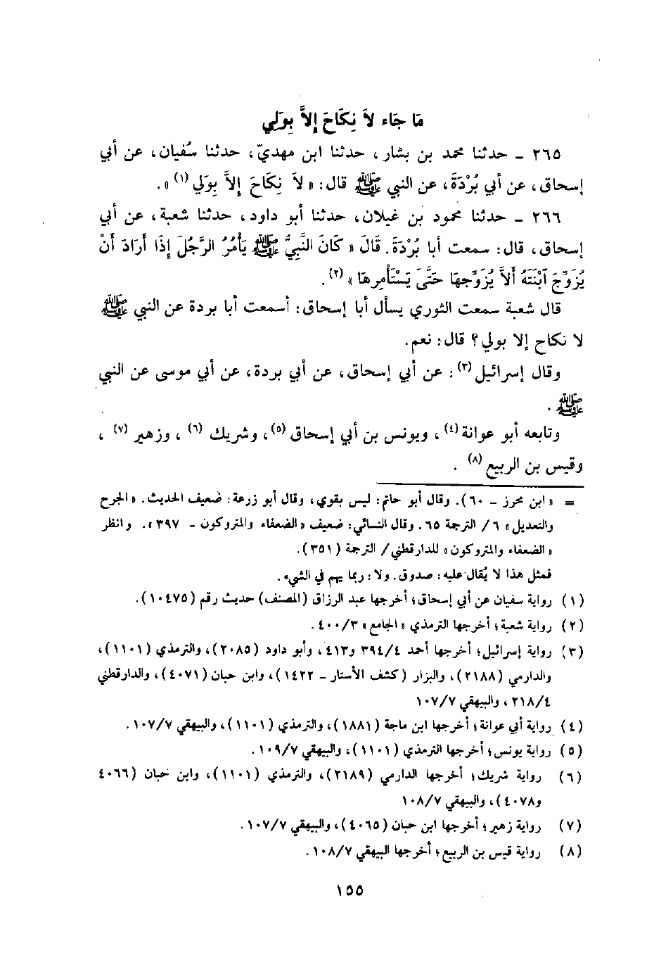 265 - حَدَّثَنَا مُحَمَّدُ بْنُ بَشَّارٍ , حَدَّثَنَا ابْنُ مَهْدِيٍّ , حَدَّثَنَا سُفْيَانُ , عَنْ أَبِي إِسْحَاقَ , عَنْ أَبِي بُرْدَةَ , عَنِ النَّبِيِّ صَلَّى اللهُ عَلَيْهِ وَسَلَّمَ قَالَ: «§لَا نِكَاحَ إِلَّا بِوَلِيٍّ»