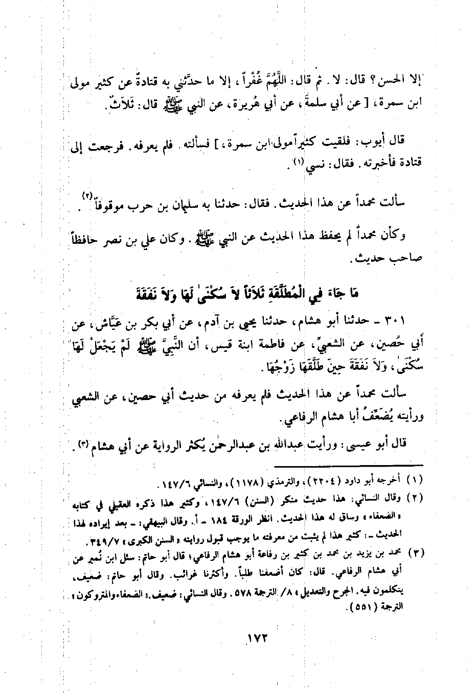 301 - حَدَّثَنَا أَبُو هِشَامٍ , حَدَّثَنَا يَحْيَى بْنُ آدَمَ , عَنْ أَبِي بَكْرِ بْنِ عَيَّاشٍ , عَنْ أَبِي حُصَيْنٍ , عَنِ الشَّعْبِيِّ , عَنْ فَاطِمَةَ ابْنَةِ قَيْسٍ , أَنَّ النَّبِيَّ صَلَّى اللهُ عَلَيْهِ وَسَلَّمَ §لَمْ يَجْعَلْ لَهَا سُكْنَى وَلَا نَفَقَةَ حِينَ طَلَّقَهَا زَوْجُهَا. سَأَلْتُ مُحَمَّدًا عَنْ هَذَا الْحَدِيثِ فَلَمْ يَعْرِفْهُ مِنْ حَدِيثِ أَبِي حُصَيْنٍ , عَنِ الشَّعْبِيِّ وَرَأَيْتُهُ يُضَعِّفُ أَبَا هِشَامٍ الرِّفَاعِيَّ. قَالَ أَبُو عِيسَى: وَرَأَيْتُ عَبْدَ اللَّهِ بْنَ عَبْدِ الرَّحْمَنِ يُكْثِرُ الرِّوَايَةَ عَنْ أَبِي هِشَامٍ