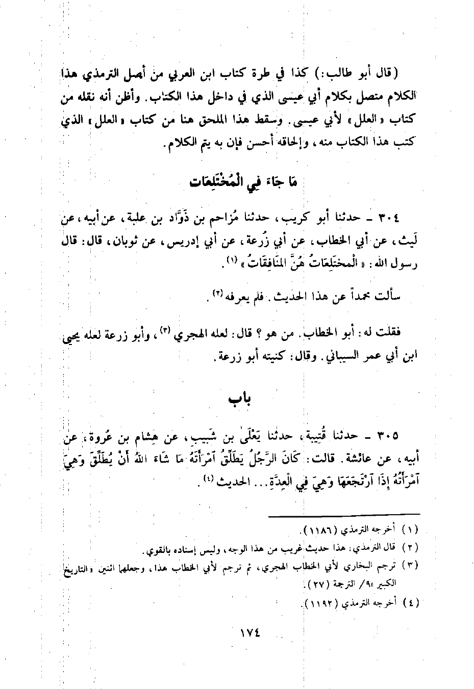 304 - حَدَّثَنَا أَبُو كُرَيْبٍ , حَدَّثَنَا مُزَاحِمُ بْنُ ذَوَّادِ بْنِ عُلْبَةَ , عَنْ أَبِيهِ , عَنْ لَيْثٍ , عَنْ أَبِي الْخَطَّابِ , عَنْ أَبِي زُرْعَةَ , عَنْ أَبِي إِدْرِيسَ , عَنْ ثَوْبَانَ , قَالَ: قَالَ رَسُولُ اللَّهِ: «§الْمُخْتَلِعَاتُ هُنَّ الْمُنَافِقَاتُ» . سَأَلْتُ مُحَمَّدًا عَنْ هَذَا الْحَدِيثِ فَلَمْ يَعْرِفْهُ فَقُلْتُ لَهُ: أَبُو الْخَطَّابِ مَنْ هُوَ؟ قَالَ: لَعَلَّهُ الْهَجَرِيُّ , وَأَبُو زُرْعَةَ لَعَلَّهُ يَحْيَى بْنُ أَبِي عُمَرَ السَّيْبَانِيُّ , وَقَالَ: كُنْيَتُهُ أَبُو زُرْعَةَ