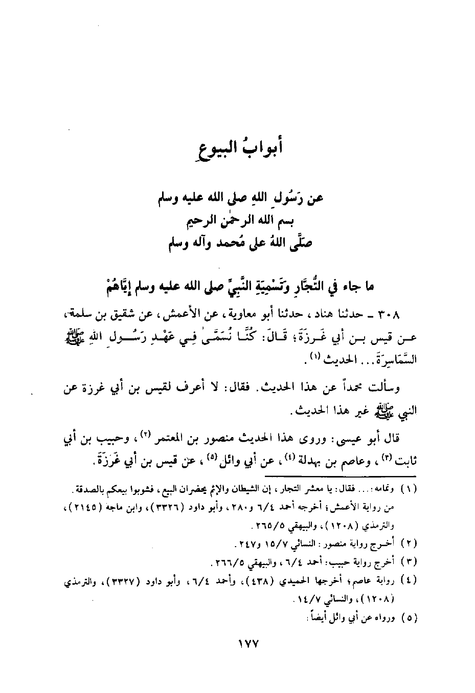 308 - حَدَّثَنَا هَنَّادٌ , حَدَّثَنَا أَبُو مُعَاوِيَةَ , عَنِ الْأَعْمَشِ , عَنْ شَقِيقِ بْنِ سَلَمَةَ , عَنْ قَيْسِ بْنِ أَبِي غَرَزَةَ , قَالَ: §كُنَّا نُسَمَّى فِي عَهْدِ رَسُولِ اللَّهِ صَلَّى اللهُ عَلَيْهِ وَسَلَّمَ السَّمَاسِرَةَ الْحَدِيثَ. وَسَأَلْتُ مُحَمَّدًا عَنْ هَذَا الْحَدِيثِ فَقَالَ: لَا أَعْرِفُ لِقَيْسِ بْنِ أَبِي غَرَزَةَ , عَنِ النَّبِيِّ صَلَّى اللهُ عَلَيْهِ وَسَلَّمَ غَيْرَ هَذَا الْحَدِيثِ قَالَ أَبُو عِيسَى: وَرَوَى هَذَا الْحَدِيثَ مَنْصُورُ بْنُ الْمُعْتَمِرِ , وَحَبِيبُ بْنُ أَبِي ثَابِتٍ , وَعَاصِمُ ابْنُ بَهْدَلَةَ , عَنْ أَبِي وَائِلٍ , عَنْ قَيْسِ بْنِ أَبِي غَرَزَةَ