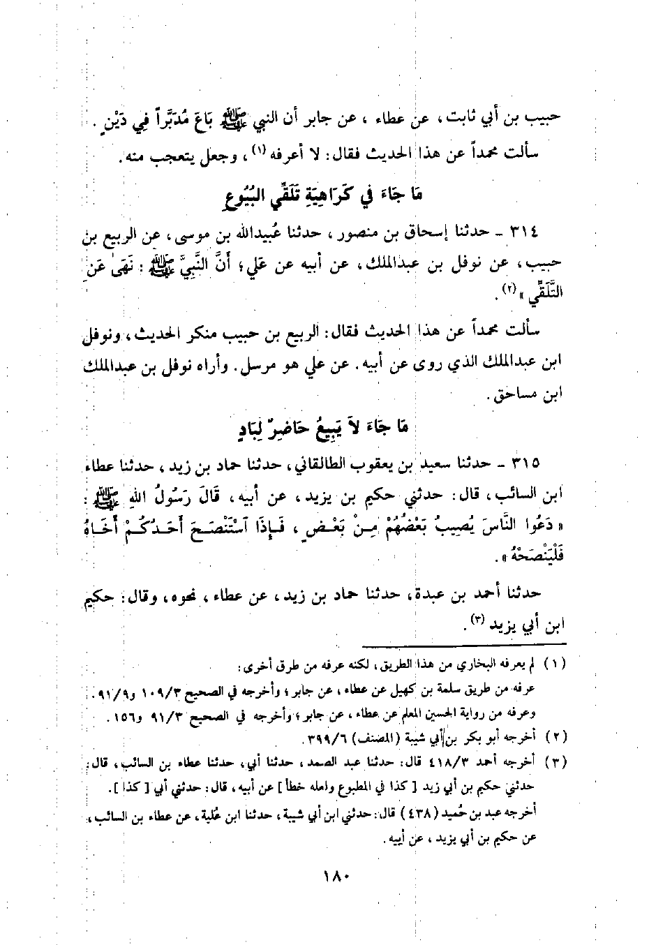 314 - حَدَّثَنَا إِسْحَاقُ بْنُ مَنْصُورٍ , حَدَّثَنَا عُبَيْدُ اللَّهِ بْنُ مُوسَى , عَنِ الرَّبِيعِ بْنِ حَبِيبٍ , عَنْ نَوْفَلِ بْنِ عَبْدِ الْمَلِكِ , عَنْ أَبِيهِ , عَنْ عَلِيٍّ , أَنَّ النَّبِيَّ صَلَّى اللهُ عَلَيْهِ وَسَلَّمَ «§نَهَى عَنِ التَّلَقِّي» . سَأَلْتُ مُحَمَّدًا عَنْ هَذَا الْحَدِيثِ فَقَالَ: الرَّبِيعُ بْنُ حَبِيبٍ مُنْكَرُ الْحَدِيثِ , وَنَوْفَلُ بْنُ عَبْدِ الْمَلِكِ الَّذِي رَوَى عَنْ أَبِيهِ , عَنْ عَلِيٍّ هُوَ مُرْسَلٌ , وَأَرَاهُ نَوْفَلُ بْنُ عَبْدِ الْمَلِكِ بْنِ مُسَاحِقٍ