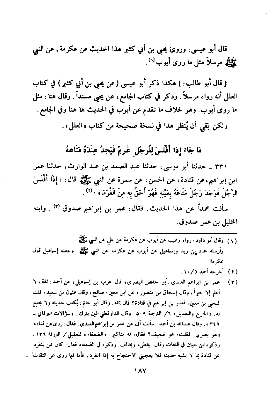 331 - حَدَّثَنَا أَبُو مُوسَى , حَدَّثَنَا عَبْدُ الصَّمَدِ بْنُ عَبْدِ الْوَارِثِ , حَدَّثَنَا عُمَرُ بْنُ إِبْرَاهِيمَ , عَنْ قَتَادَةَ , عَنِ الْحَسَنِ , عَنْ سَمُرَةَ , عَنِ النَّبِيِّ صَلَّى اللهُ عَلَيْهِ وَسَلَّمَ قَالَ: «§إِذَا أَفْلَسَ الرَّجُلُ فَوَجَدَ رَجُلٌ مَتَاعَهُ بِعَيْنِهِ فَهُوَ أَحَقُّ بِهِ مِنَ الْغُرَمَاءِ» . سَأَلْتُ مُحَمَّدًا عَنْ هَذَا الْحَدِيثِ فَقَالَ: عُمَرُ بْنُ إِبْرَاهِيمَ صَدُوقٌ , وَابْنُهُ الْخَلِيلُ بْنُ عُمَرَ صَدُوقٌ. قُلْتُ لَهُ: هَلْ رَوَى هَذَا الْحَدِيثَ عَنْ قَتَادَةَ غَيْرُ عُمَرَ بْنِ إِبْرَاهِيمَ؟ قَالَ: لَا أَعْلَمُهُ وَهُوَ بَصْرِيُّ