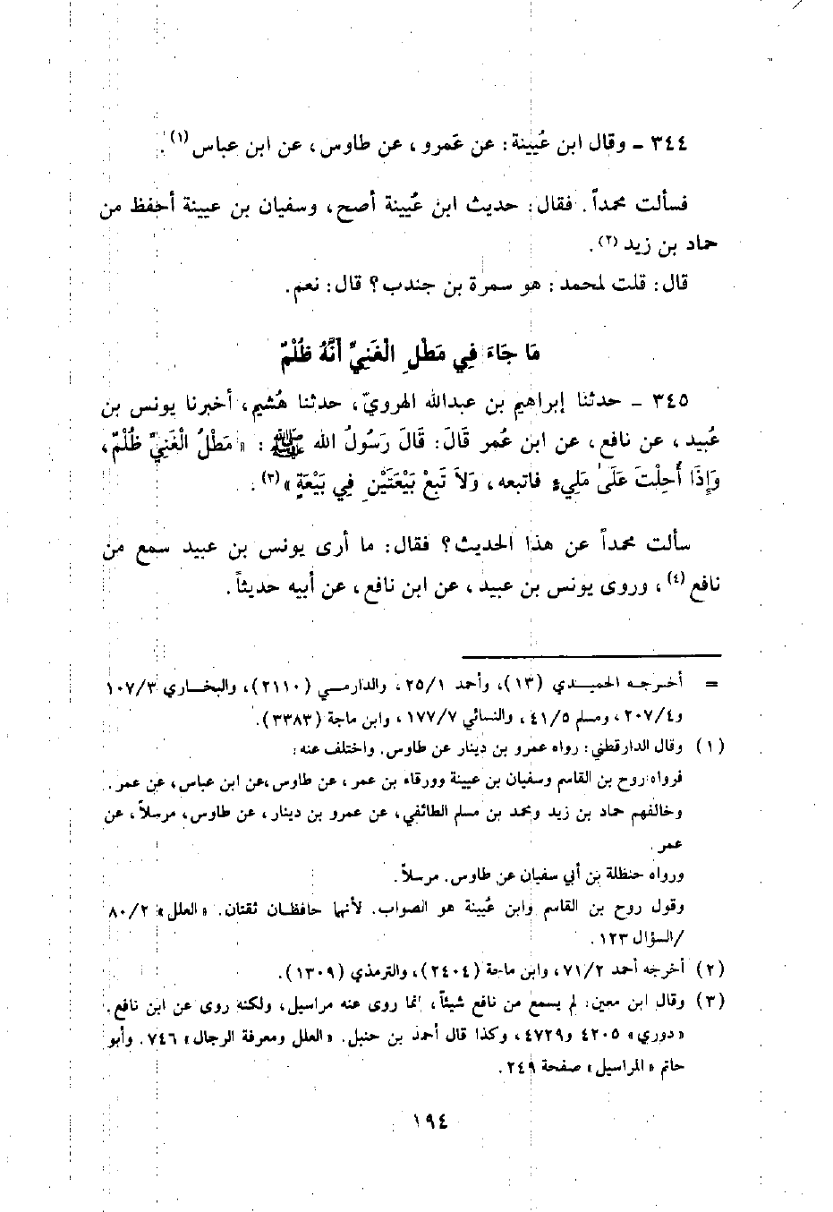 345 - حَدَّثَنَا إِبْرَاهِيمُ بْنُ عَبْدِ اللَّهِ الْهَرَوِيُّ , حَدَّثَنَا هُشَيْمٌ , أَخْبَرَنَا يُونُسُ بْنُ عُبَيْدٍ , عَنْ نَافِعٍ , عَنِ ابْنِ عُمَرَ , قَالَ: قَالَ رَسُولُ اللَّهِ صَلَّى اللهُ عَلَيْهِ وَسَلَّمَ: «§مَطْلُ الْغَنِيِّ ظُلْمٌ , وَإِذَا أُحِلْتَ عَلَى مَلِيءٍ فَاتْبَعْهُ , وَلَا تَبِعْ بَيْعَتَيْنِ فِي بَيْعَةٍ» . سَأَلْتُ مُحَمَّدًا عَنْ هَذَا الْحَدِيثِ فَقَالَ: مَا أَرَى يُونُسَ بْنَ عُبَيْدٍ سَمِعَ مِنَ نَافِعٍ. وَرَوَى يُونُسُ بْنُ عُبَيْدٍ , عَنِ ابْنِ نَافِعٍ , عَنْ أَبِيهِ حَدِيثًا