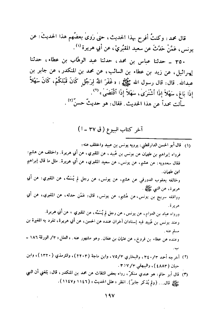 350 - حَدَّثَنَا عَبَّاسُ بْنُ مُحَمَّدٍ , حَدَّثَنَا عَبْدُ الْوَهَّابِ بْنُ عَطَاءٍ , حَدَّثَنَا إِسْرَائِيلُ , عَنْ زَيْدِ بْنِ عَطَاءِ بْنِ السَّائِبِ , عَنْ مُحَمَّدِ بْنِ الْمُنْكَدِرِ , عَنْ جَابِرِ بْنِ عَبْدِ اللَّهِ , قَالَ: قَالَ رَسُولُ اللَّهِ صَلَّى اللهُ عَلَيْهِ وَسَلَّمَ §غَفَرَ اللَّهُ لِرَجُلٍ كَانَ قَبْلَكُمْ كَانَ سَهْلًا إِذَا بَاعَ , سَهْلًا إِذَا اشْتَرَى , سَهْلًا إِذَا اقْتَضَى ". سَأَلْتُ مُحَمَّدًا عَنْ هَذَا الْحَدِيثِ فَقَالَ: هُوَ حَدِيثٌ حَسَنٌ