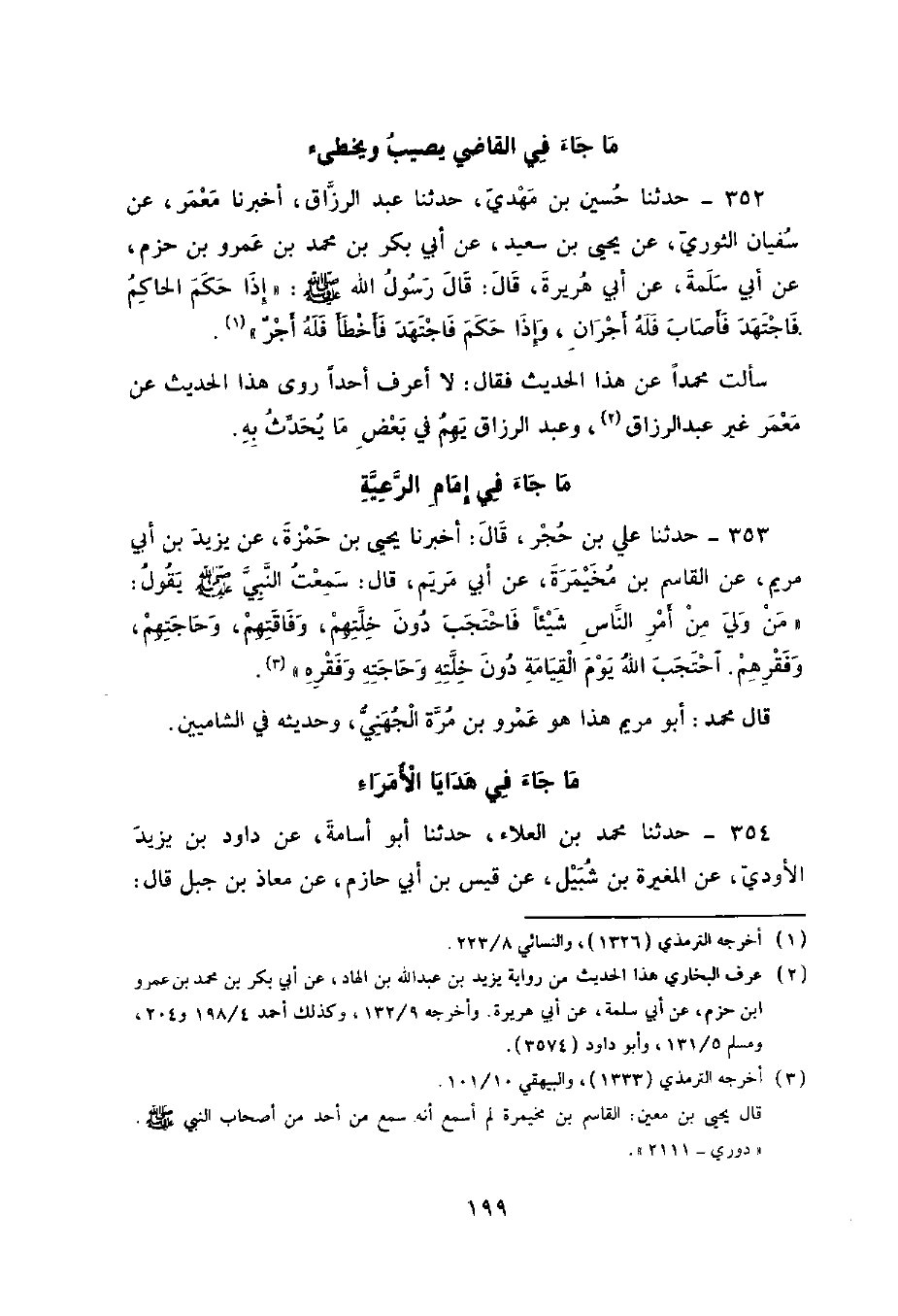 352 - حَدَّثَنَا حُسَيْنُ بْنُ مَهْدِيٍّ , حَدَّثَنَا عَبْدُ الرَّزَّاقِ , أَخْبَرَنَا مَعْمَرٌ , عَنْ سُفْيَانَ الثَّوْرِيِّ , عَنْ يَحْيَى بْنِ سَعِيدٍ , عَنْ أَبِي بَكْرِ بْنِ مُحَمَّدِ بْنِ عَمْرِو بْنِ حَزْمٍ , عَنْ أَبِي سَلَمَةَ , عَنْ أَبِي هُرَيْرَةَ , قَالَ: قَالَ رَسُولُ اللَّهِ صَلَّى اللهُ عَلَيْهِ وَسَلَّمَ: «§إِذَا حَكَمَ الْحَاكِمُ فَاجْتَهَدَ فَأَصَابَ فَلَهُ أَجْرَانِ , وَإِذَا حَكَمَ فَاجْتَهَدَ فَأَخْطَأَ فَلَهُ أَجْرٌ» . سَأَلْتُ مُحَمَّدًا عَنْ هَذَا الْحَدِيثِ فَقَالَ: لَا أَعْرِفُ أَحَدًا رَوَى هَذَا الْحَدِيثَ عَنْ مَعْمَرٍ غَيْرُ عَبْدِ الرَّزَّاقِ , وَعَبْدُ الرَّزَّاقِ يَهِمُ فِي بَعْضِ مَا يُحَدِّثُ بِهِ