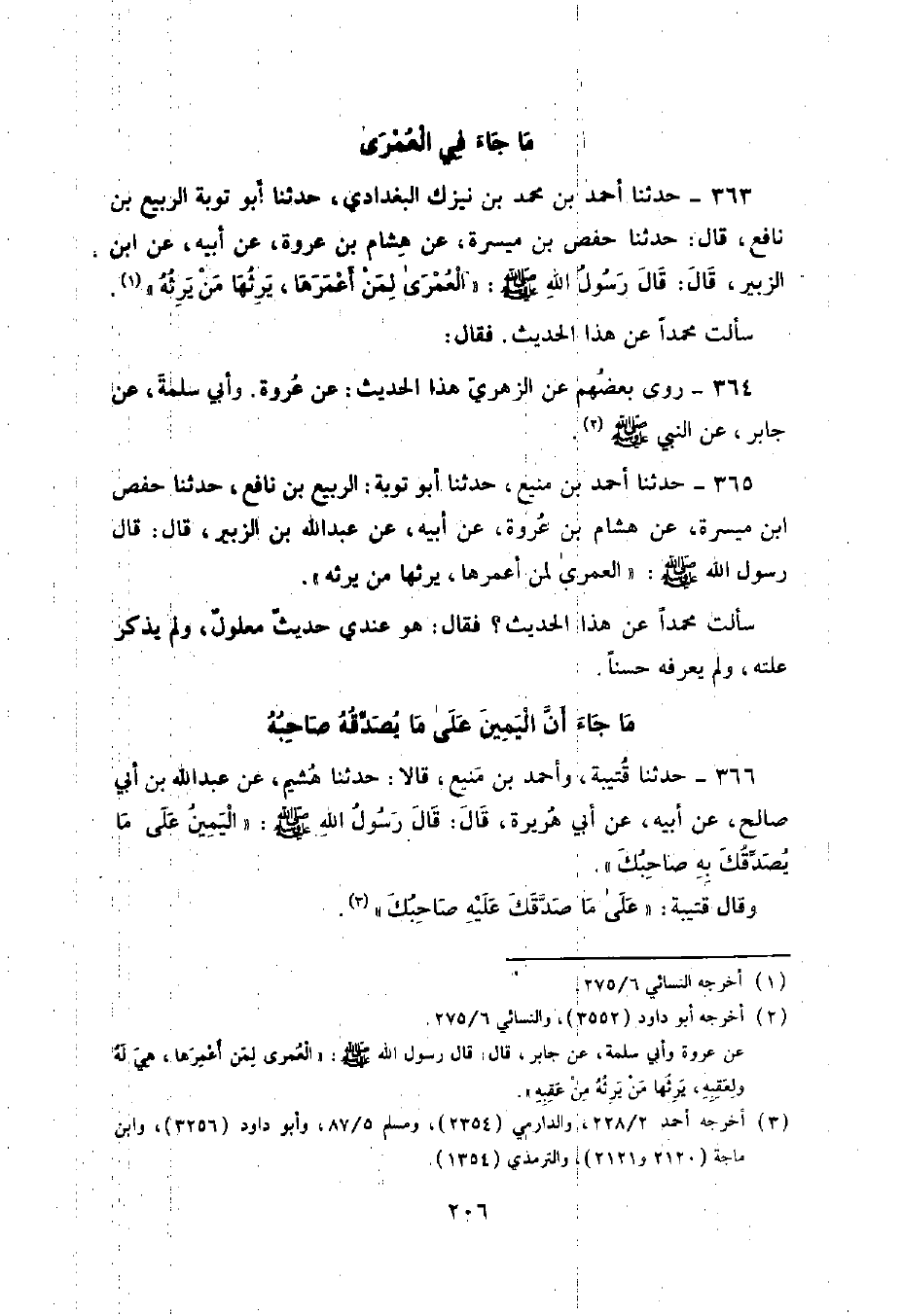 363 - حَدَّثَنَا أَحْمَدُ بْنُ مُحَمَّدِ بْنِ نِيزَكَ الْبَغْدَادِيُّ , حَدَّثَنَا أَبُو تَوْبَةَ الرَّبِيعُ بْنُ نَافِعٍ , قَالَ: حَدَّثَنَا حَفْصُ بْنُ مَيْسَرَةَ , عَنْ هِشَامِ بْنِ عُرْوَةَ , عَنْ أَبِيهِ , عَنِ ابْنِ الزُّبَيْرِ , قَالَ: قَالَ رَسُولُ اللَّهِ صَلَّى اللهُ عَلَيْهِ وَسَلَّمَ: «§الْعُمْرَى لِمَنْ أَعْمَرَهَا يَرِثُهَا مَنْ يَرِثُهُ» . سَأَلْتُ مُحَمَّدًا عَنْ هَذَا الْحَدِيثِ فَقَالَ: