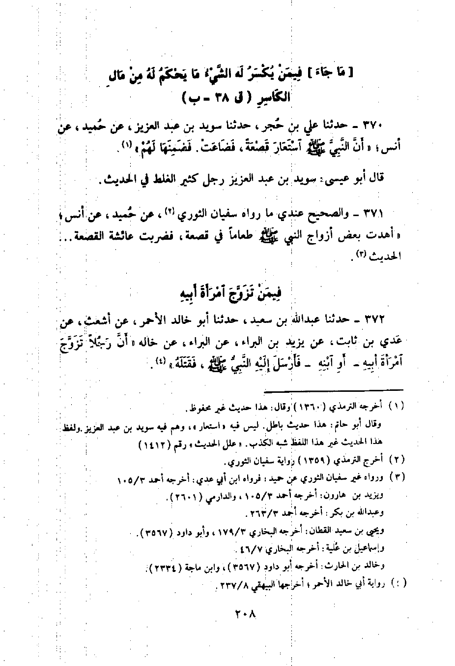 372 - حَدَّثَنَا عَبْدُ اللَّهِ بْنُ سَعِيدٍ , حَدَّثَنَا أَبُو خَالِدٍ الْأَحْمَرُ , عَنْ أَشْعَثَ , عَنْ عَدِيِّ بْنِ ثَابِتٍ , عَنْ يَزِيدَ بْنِ الْبَرَاءِ , عَنِ الْبَرَاءِ , عَنْ خَالِهِ , أَنَّ §رَجُلًا تَزَوَّجَ امْرَأَةَ أَبِيهِ أَوِ ابْنِهِ فَأَرْسَلَ إِلَيْهِ النَّبِيُّ صَلَّى اللهُ عَلَيْهِ وَسَلَّمَ فَقَتَلَهُ -[209]-. وَقَالَ حَفْصٌ: عَنْ أَشْعَثَ , عَنْ عَدِيِّ بْنِ ثَابِتٍ , عَنِ الْبَرَاءِ قَالَ: مَرَّ بِي خَالِي أَبُو بُرْدَةَ , وَقَالَ مُحَمَّدُ بْنُ إِسْحَاقَ: عَنْ عَدِيِّ بْنِ ثَابِتٍ , عَنْ عَبْدِ اللَّهِ بْنِ يَزِيدَ , عَنِ الْبَرَاءِ , فَسَأَلْتُ مُحَمَّدًا عَنْ هَذَا الْحَدِيثِ فَقَالَ: إِنَّ مَعْمَرًا رَوَى هَذَا الْحَدِيثَ فَقَالَ: عَنْ عَدِيِّ بْنِ ثَابِتٍ , عَنْ يَزِيدَ بْنِ الْبَرَاءِ , عَنْ أَبِيهِ , وَلَمْ يَذْكُرْ فِيهِ أَيَّ الرِّوَايَاتِ أَصَحَّ
