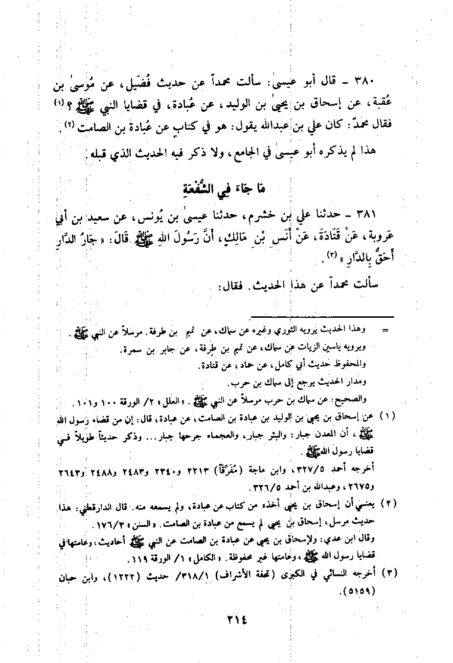 381 - حَدَّثَنَا عَلِيُّ بْنُ خَشْرَمٍ , حَدَّثَنَا عِيسَى بْنُ يُونُسَ , عَنْ سَعِيدِ بْنِ أَبِي عَرُوبَةَ , عَنْ قَتَادَةَ , عَنْ أَنَسِ بْنِ مَالِكٍ , أَنَّ رَسُولَ اللَّهِ صَلَّى اللهُ عَلَيْهِ وَسَلَّمَ قَالَ: «§جَارُ الدَّارِ أَحَقُّ بِالدَّارِ» . سَأَلْتُ مُحَمَّدًا عَنْ هَذَا الْحَدِيثِ فَقَالَ: