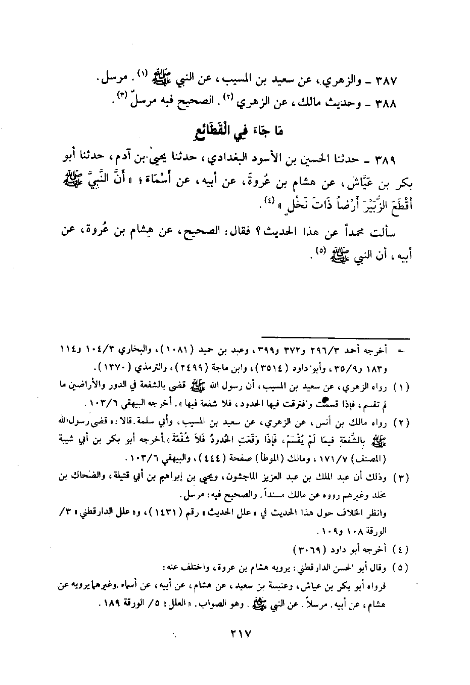 389 - حَدَّثَنَا الْحُسَيْنُ بْنُ الْأَسْوَدِ الْبَغْدَادِيُّ , حَدَّثَنَا يَحْيَى بْنُ آدَمَ , حَدَّثَنَا أَبُو بَكْرِ بْنُ عَيَّاشٍ , عَنْ هِشَامِ بْنِ عُرْوَةَ , عَنْ أَبِيهِ , عَنْ أَسْمَاءَ , أَنَّ النَّبِيَّ صَلَّى اللهُ عَلَيْهِ وَسَلَّمَ §أَقْطَعَ الزُّبَيْرَ أَرْضًا ذَاتَ نَخْلٍ. سَأَلْتُ مُحَمَّدًا عَنْ هَذَا الْحَدِيثِ فَقَالَ: الصَّحِيحُ عَنْ هِشَامِ بْنِ عُرْوَةَ , عَنْ أَبِيهِ أَنَّ النَّبِيَّ صَلَّى اللهُ عَلَيْهِ وَسَلَّمَ