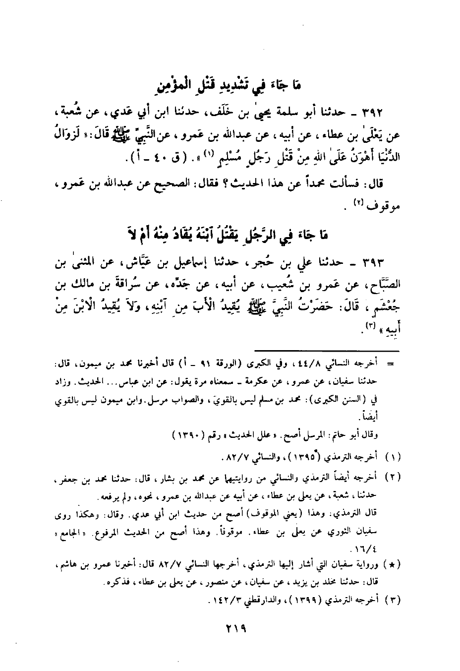 392 - حَدَّثَنَا أَبُو سَلَمَةَ يَحْيَى بْنُ خَلَفٍ , حَدَّثَنَا ابْنُ أَبِي عَدِيٍّ , عَنْ شُعْبَةَ , عَنْ يَعْلَى بْنِ عَطَاءٍ , عَنْ أَبِيهِ , عَنْ عَبْدِ اللَّهِ بْنِ عَمْرٍو , عَنِ النَّبِيِّ صَلَّى اللهُ عَلَيْهِ وَسَلَّمَ قَالَ: «§لَزَوَالُ الدُّنْيَا أَهْوَنُ عَلَى اللَّهِ مِنْ قَتْلِ رَجُلٍ مُسْلِمٍ» . قَالَ: فَسَأَلْتُ مُحَمَّدًا عَنْ هَذَا الْحَدِيثِ فَقَالَ: الصَّحِيحُ عَنْ عَبْدِ اللَّهِ بْنِ عَمْرٍو مَوْقُوفٌ
