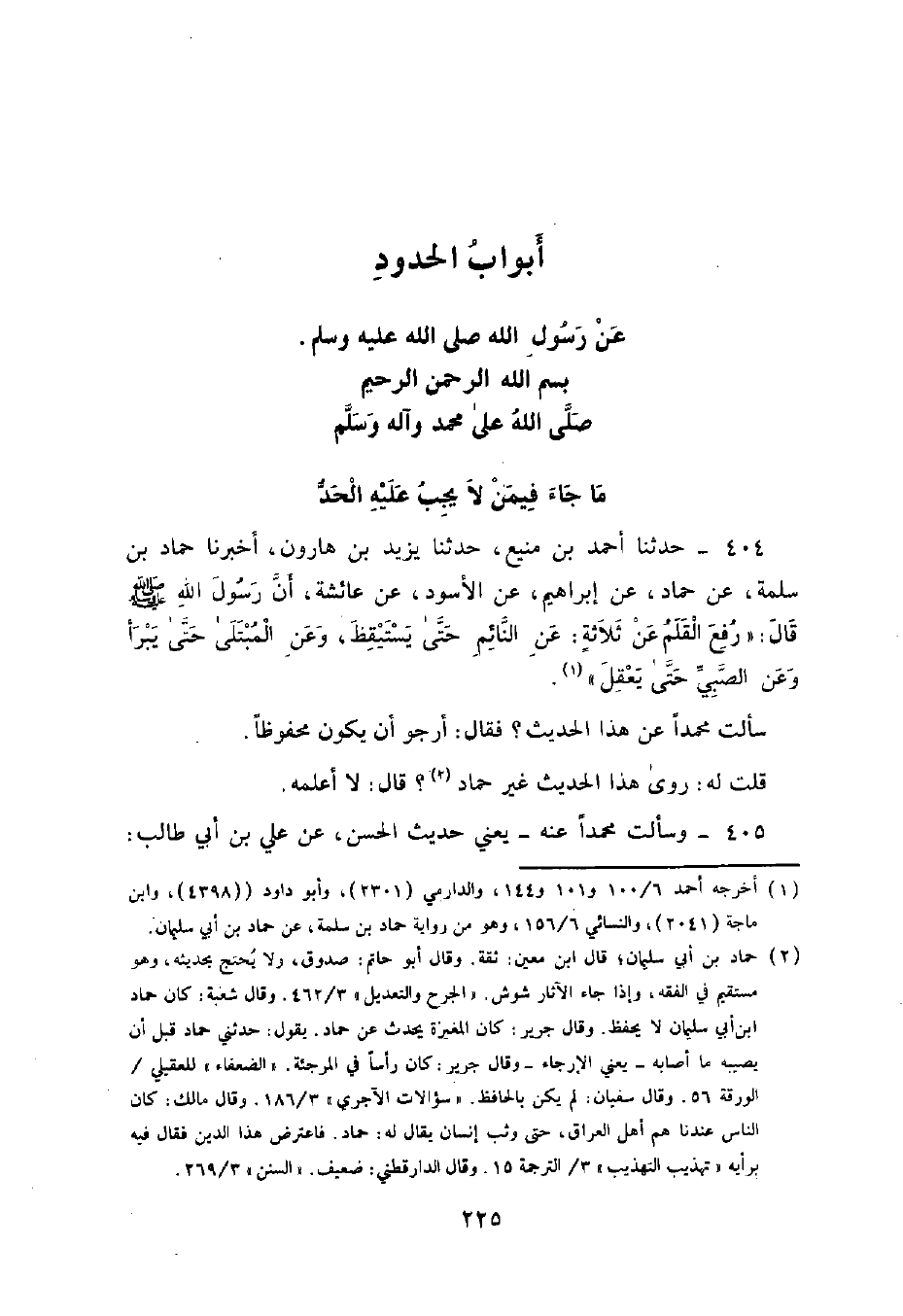 404 - حَدَّثَنَا أَحْمَدُ بْنُ مَنِيعٍ , حَدَّثَنَا يَزِيدُ بْنُ هَارُونَ , أَخْبَرَنَا حَمَّادُ بْنُ سَلَمَةَ , عَنْ حَمَّادٍ , عَنْ إِبْرَاهِيمَ , عَنِ الْأَسْوَدِ , عَنْ عَائِشَةَ , أَنَّ رَسُولَ اللَّهِ صَلَّى اللهُ عَلَيْهِ وَسَلَّمَ قَالَ: " §رُفِعَ الْقَلَمُ عَنْ ثَلَاثَةٍ: عَنِ النَّائِمِ حَتَّى يَسْتَيْقِظَ , وَعَنِ الْمُبْتَلَى حَتَّى يَبْرَأَ , وَعَنِ الصَّبِيِّ حَتَّى يَعْقِلَ ". سَأَلْتُ مُحَمَّدًا عَنْ هَذَا الْحَدِيثِ فَقَالَ: أَرْجُو أَنْ يَكُونَ مَحْفُوظًا. قُلْتُ لَهُ: رَوَى هَذَا الْحَدِيثَ غَيْرُ حَمَّادٍ؟ قَالَ: لَا أَعْلَمُهُ.