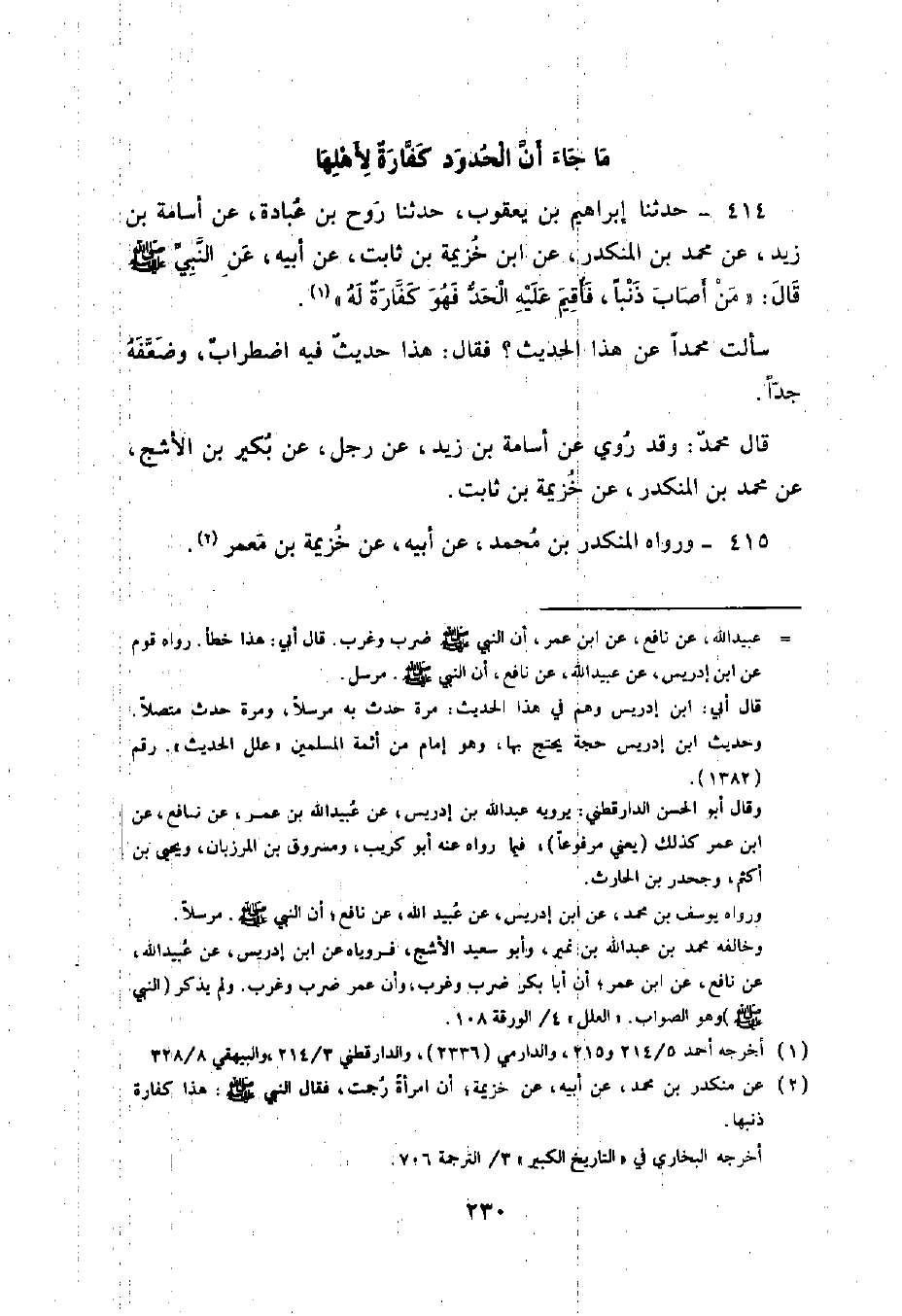 414 - حَدَّثَنَا إِبْرَاهِيمُ بْنُ يَعْقُوبَ , حَدَّثَنَا رَوْحُ بْنُ عُبَادَةَ , عَنْ أُسَامَةَ بْنِ زَيْدٍ , عَنْ مُحَمَّدِ بْنِ الْمُنْكَدِرِ , عَنِ ابْنِ خُزَيْمَةَ بْنِ ثَابِتٍ , عَنْ أَبِيهِ , عَنِ النَّبِيِّ صَلَّى اللهُ عَلَيْهِ وَسَلَّمَ قَالَ: «§مَنْ أَصَابَ ذَنْبًا فَأُقِيمَ عَلَيْهِ الْحَدُّ فَهُوَ كَفَّارَةٌ لَهُ» . سَأَلْتُ مُحَمَّدًا عَنْ هَذَا الْحَدِيثِ فَقَالَ: هَذَا حَدِيثٌ فِيهِ اضْطِرَابٌ , وَضَعَّفَهُ جِدًّا قَالَ مُحَمَّدٌ: وَقَدْ رُوِيَ عَنْ أُسَامَةَ بْنِ زَيْدٍ , عَنْ رَجُلٍ , عَنْ بُكَيْرِ بْنِ الْأَشَجِّ , عَنْ مُحَمَّدِ بْنِ الْمُنْكَدِرِ , عَنْ خُزَيْمَةَ بْنِ ثَابِتٍ