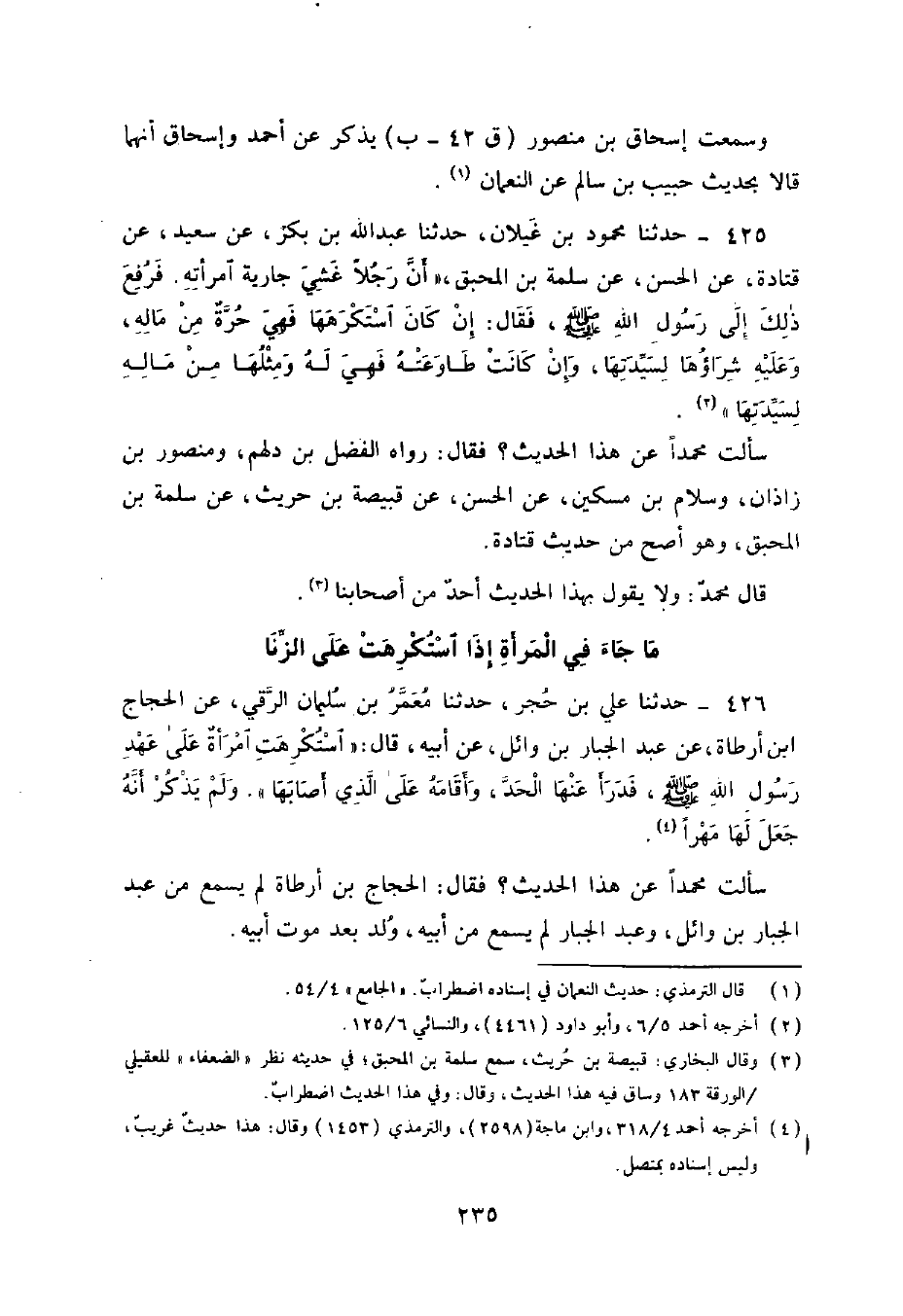 426 - حَدَّثَنَا عَلِيُّ بْنُ حُجْرٍ , حَدَّثَنَا مَعْمَرُ بْنُ سُلَيْمَانَ الرَّقِّيُّ , عَنِ الْحَجَّاجِ بْنِ أَرْطَاةَ , عَنْ عَبْدِ الْجَبَّارِ بْنِ وَائِلٍ , عَنْ أَبِيهِ , قَالَ: §اسْتُكْرِهَتِ امْرَأَةٌ عَلَى عَهْدِ رَسُولِ اللَّهِ صَلَّى اللهُ عَلَيْهِ وَسَلَّمَ فَدَرَأَ عَنْهَا الْحَدَّ وَأَقَامَهُ عَلَى الَّذِي أَصَابَهَا , وَلَمْ يَذْكُرُ أَنَّهُ جَعَلَ لَهَا مَهْرًا. سَأَلْتُ مُحَمَّدًا عَنْ هَذَا الْحَدِيثِ فَقَالَ: الْحَجَّاجُ بْنُ أَرْطَاةَ لَمْ يَسْمَعْ مِنْ عَبْدِ الْجَبَّارِ بْنِ وَائِلٍ , وَعَبْدِ الْجَبَّارِ لَمْ يَسْمَعْ مِنْ أَبِيهِ , وُلِدَ بَعْدَ مَوْتِ أَبِيهِ