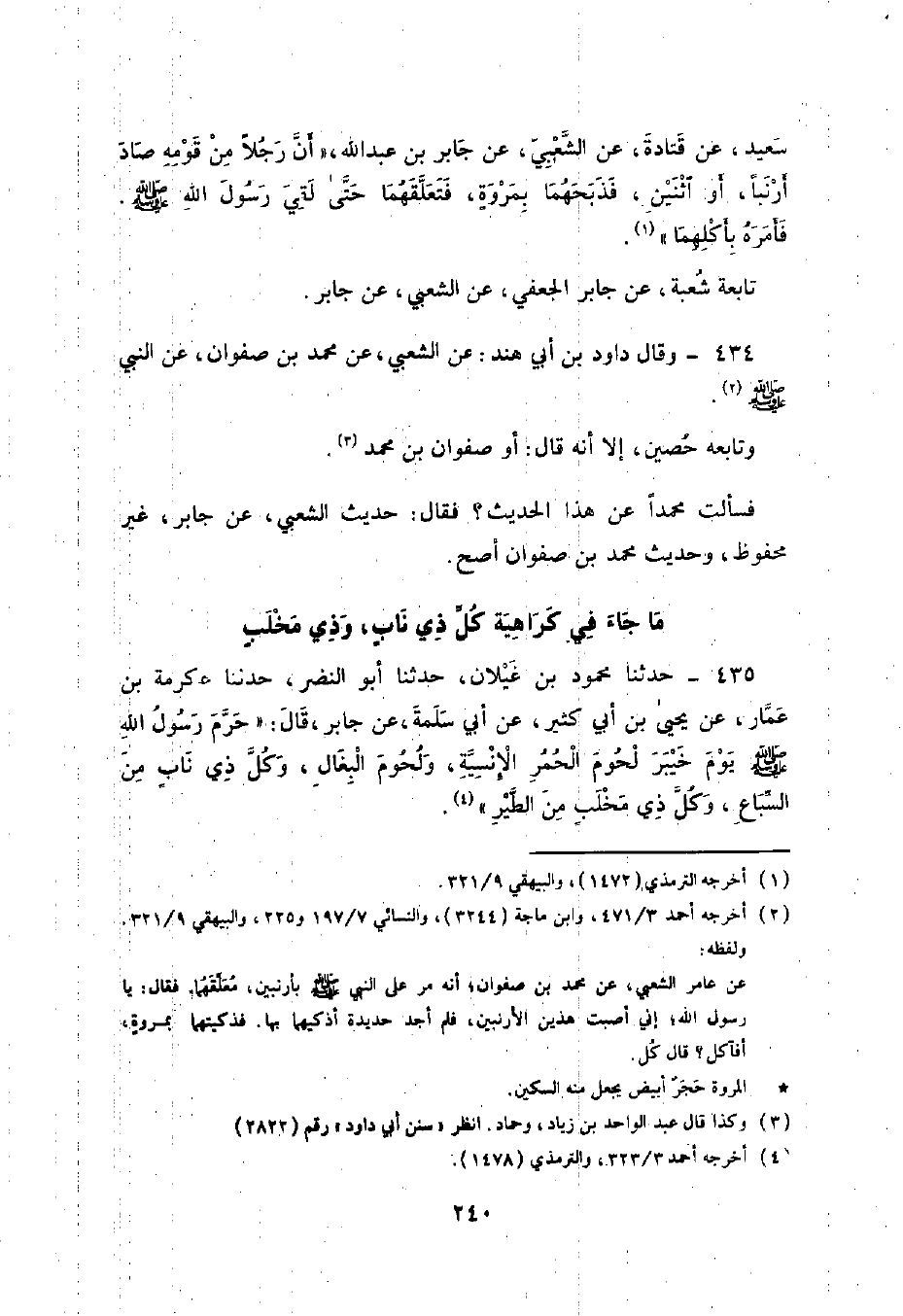 435 - حَدَّثَنَا مَحْمُودُ بْنُ غَيْلَانَ , حَدَّثَنَا أَبُو النَّضْرِ , حَدَّثَنَا عِكْرِمَةُ بْنُ عَمَّارٍ , عَنْ يَحْيَى بْنِ أَبِي كَثِيرٍ , عَنْ أَبِي سَلَمَةَ , عَنْ جَابِرٍ , قَالَ: §حَرَّمَ رَسُولُ اللَّهِ صَلَّى اللهُ عَلَيْهِ وَسَلَّمَ يَوْمَ خَيْبَرَ لُحُومَ الْحُمُرِ الْإِنْسِيَّةِ وَلُحُومَ الْبِغَالِ وَكُلَّ ذِي نَابٍ مِنَ السِّبَاعِ وَكُلَّ ذِي مِخْلَبٍ مِنَ الطَّيْرِ ".
