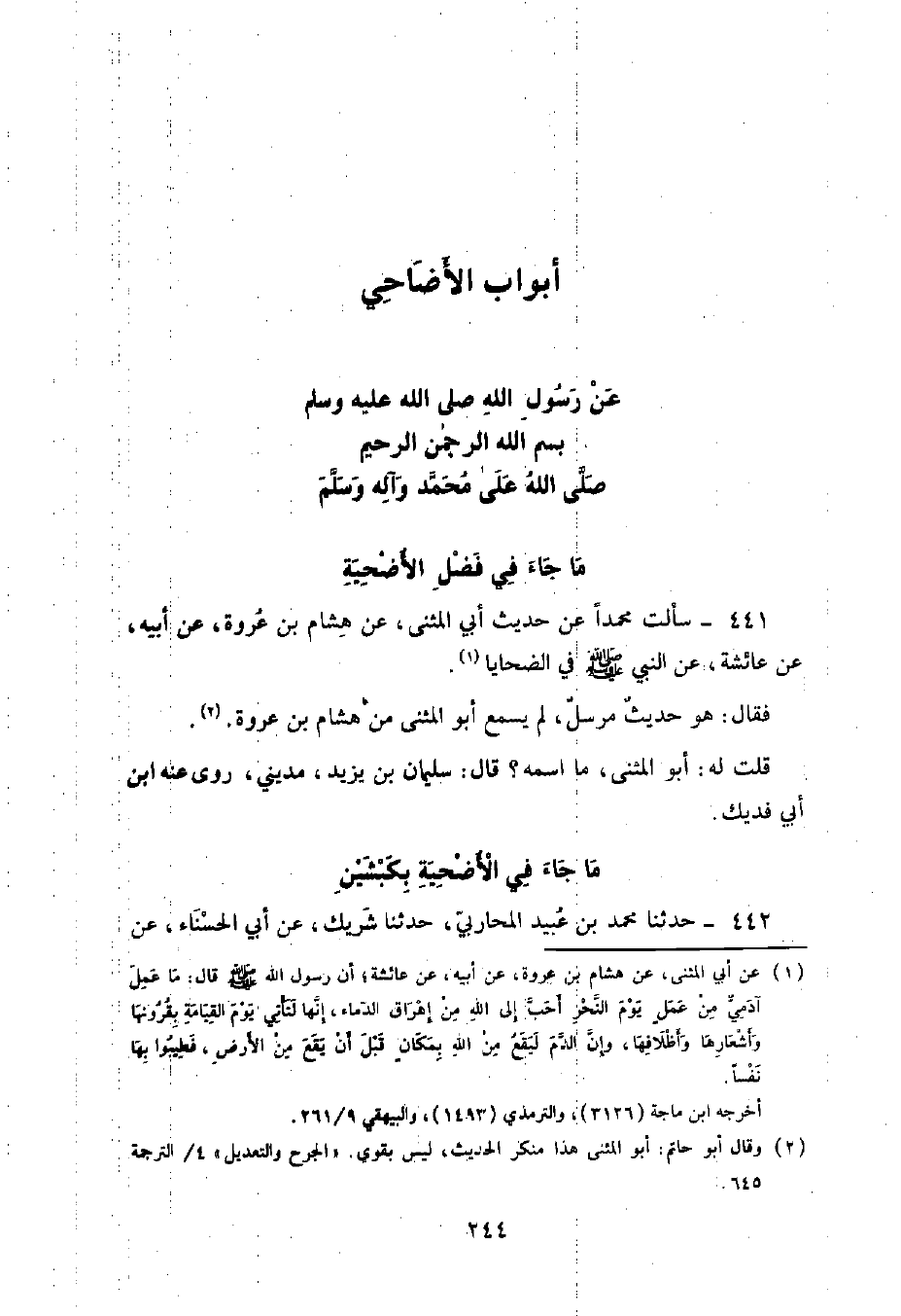 §أَبْوَابُ الْأَضَاحِي عَنْ رَسُولِ اللَّهِ صَلَّى اللهُ عَلَيْهِ وَسَلَّمَ بِسْمِ اللَّهِ الرَّحْمَنِ الرَّحِيمِ صَلَّى اللَّهُ عَلَى مُحَمَّدٍ وَآلِهِ وَسَلَّمَ