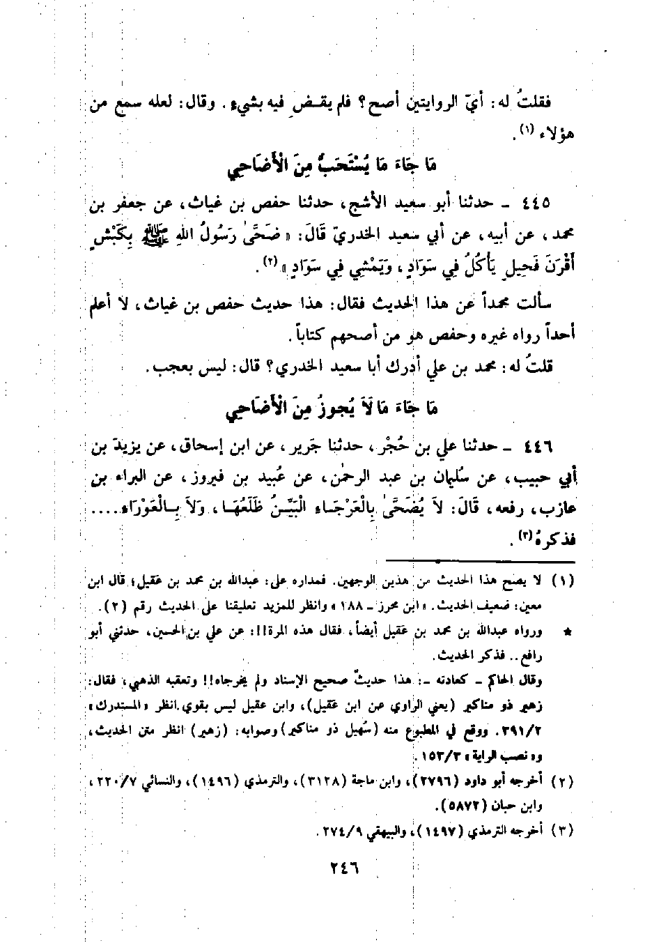 445 - حَدَّثَنَا أَبُو سَعِيدٍ الْأَشَجُّ , حَدَّثَنَا حَفْصُ بْنُ غِيَاثٍ , عَنْ جَعْفَرِ بْنِ مُحَمَّدٍ , عَنْ أَبِيهِ , عَنْ أَبِي سَعِيدٍ الْخُدْرِيِّ , قَالَ: §ضَحَّى رَسُولُ اللَّهِ صَلَّى اللهُ عَلَيْهِ وَسَلَّمَ بِكَبْشٍ أَقْرَنَ فَحِيلٍ يَأْكُلُ فِي سَوَّادٍ , وَيَمْشِي فِي سَوَّادٍ. سَأَلْتُ مُحَمَّدًا عَنْ هَذَا الْحَدِيثِ فَقَالَ: هَذَا حَدِيثُ حَفْصِ بْنِ غِيَاثٍ , لَا أَعْلَمُ أَحَدًا رَوَاهُ غَيْرُهُ , وَحَفْصٌ هُوَ مِنْ أَصَحِّهِمْ كِتَابًا. قُلْتُ لَهُ: مُحَمَّدُ بْنُ عَلِيٍّ أَدْرَكَ أَبَا سَعِيدٍ الْخُدْرِيَّ؟ قَالَ: لَيْسَ بَعَجَبٍ