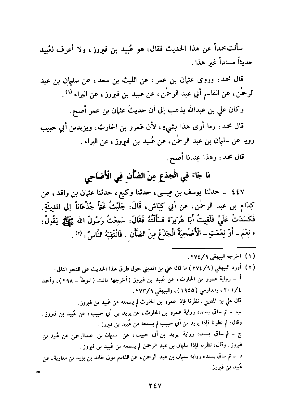 447 - حَدَّثَنَا يُوسُفُ بْنُ عِيسَى , حَدَّثَنَا وَكِيعٌ , حَدَّثَنَا عُثْمَانُ بْنُ وَاقِدٍ , عَنْ كِدَامِ بْنِ عَبْدِ الرَّحْمَنِ , عَنْ أَبِي كِبَاشٍ , قَالَ: جَلَبْتُ غَنَمًا جُذْعَانًا إِلَى الْمَدِينَةِ فَكَسَدَتْ عَلَيَّ فَلَقِيتُ أَبَا هُرَيْرَةَ فَسَأَلْتُهُ فَقَالَ: سَمِعْتُ رَسُولَ اللَّهِ صَلَّى اللهُ عَلَيْهِ وَسَلَّمَ يَقُولُ: «§نِعْمَ، أَوْ نِعْمَتِ الْأُضْحِيَّةُ الْجَذَعُ مِنَ الضَّأْنِ» . فَانْتَهَبَهُ النَّاسُ. سَأَلْتُ مُحَمَّدًا عَنْ هَذَا الْحَدِيثِ فَقَالَ: رَوَى هَذَا الْحَدِيثَ عُثْمَانُ بْنُ وَاقِدٍ فَرَفَعَهُ إِلَى النَّبِيِّ صَلَّى اللهُ عَلَيْهِ وَسَلَّمَ. وَرَوَى عَنْهُ غَيْرُ عُثْمَانَ بْنِ وَاقِدٍ عَنْ أَبِي هُرَيْرَةَ مَوْقُوفًا. قُلْتُ لَهُ: مَا اسْمُ أَبِي كِبَاشٍ؟ قَالَ: لَا أَعْرِفُ اسْمَهُ