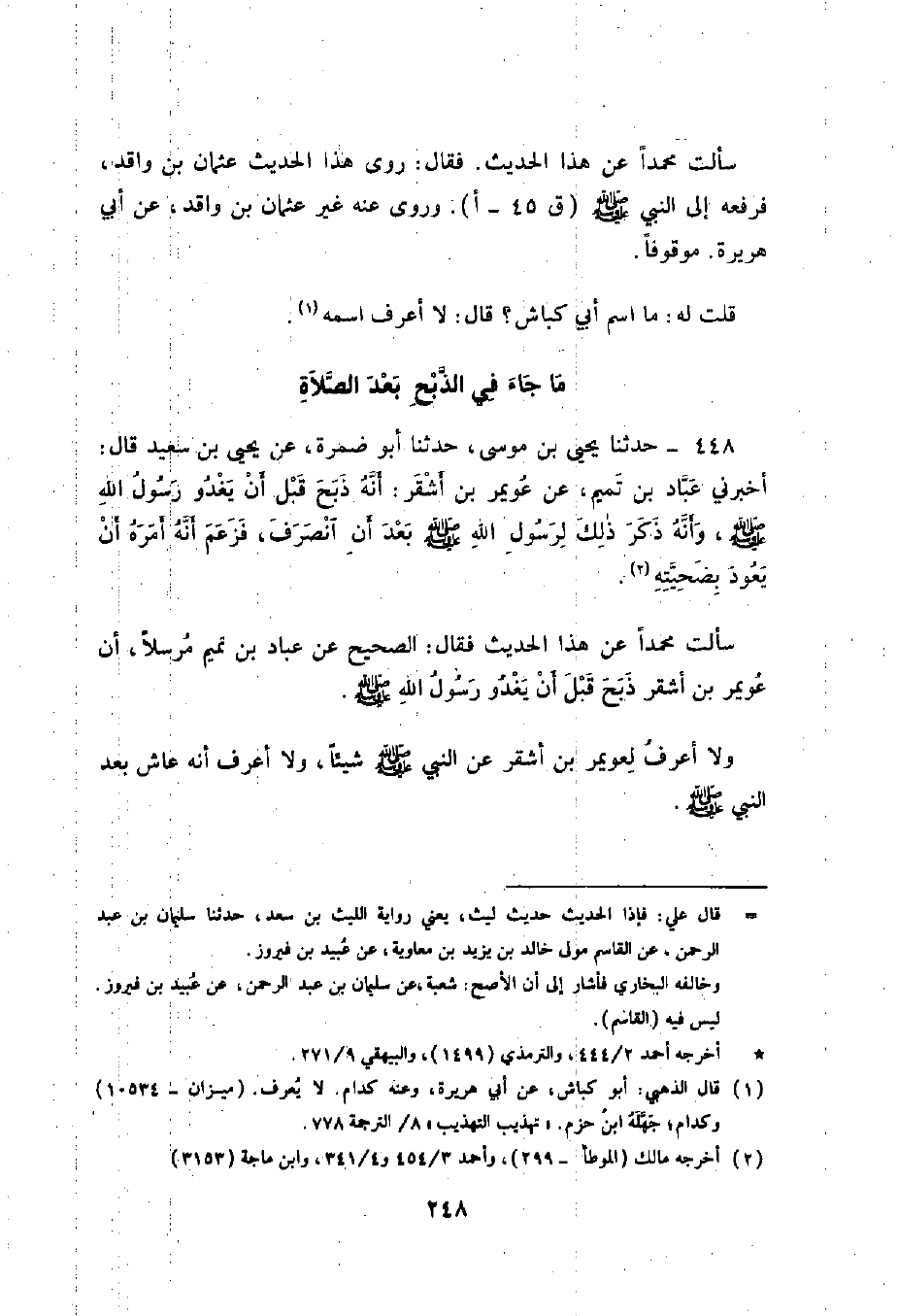 448 - حَدَّثَنَا يَحْيَى بْنُ مُوسَى , حَدَّثَنَا أَبُو ضَمْرَةَ , عَنْ يَحْيَى بْنِ سَعِيدٍ , قَالَ: أَخْبَرَنِي عَبَّادُ بْنُ تَمِيمٍ , عَنْ عُوَيْمِرِ بْنِ أَشْقَرَ , أَنَّهُ §ذَبَحَ قَبْلَ أَنْ يَغْدُوَ رَسُولُ اللَّهِ صَلَّى اللهُ عَلَيْهِ وَسَلَّمَ , وَأَنَّهُ ذَكَرَ ذَلِكَ لِرَسُولِ اللَّهِ صَلَّى اللهُ عَلَيْهِ وَسَلَّمَ بَعْدَ أَنَّ انْصَرَفَ فَزَعَمَ أَنَّهُ أَمَرَهُ أَنْ يَعُودَ بِضَحِيَّتِهِ. سَأَلْتُ مُحَمَّدًا عَنْ هَذَا الْحَدِيثِ فَقَالَ: الصَّحِيحُ عَنْ عَبَّادِ بْنِ تَمِيمٍ مُرْسَلًا. أَنَّ عُوَيْمِرِ بْنَ أَشْقَرَ ذَبَحَ قَبْلَ أَنْ يَغْدُوَ رَسُولُ اللَّهِ صَلَّى اللهُ عَلَيْهِ وَسَلَّمَ. وَلَا أَعْرِفُ لِعُوَيْمِرِ بْنِ أَشْقَرَ , عَنِ النَّبِيِّ صَلَّى اللهُ عَلَيْهِ وَسَلَّمَ شَيْئًا , وَلَا أَعْرِفُ أَنَّهُ عَاشَ بَعْدَ النَّبِيِّ صَلَّى اللهُ عَلَيْهِ وَسَلَّمَ