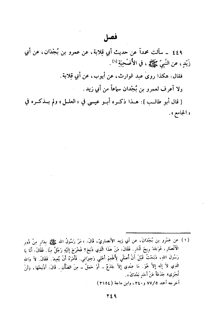 449 - سَأَلْتُ مُحَمَّدًا عَنْ حَدِيثِ أَبِي قِلَابَةَ , عَنْ عَمْرِو بْنِ بُجْدَانَ , عَنْ أَبِي زَيْدٍ , عَنِ النَّبِيِّ صَلَّى اللهُ عَلَيْهِ وَسَلَّمَ فِي الْأُضْحِيَّةِ فَقَالَ: هَكَذَا رَوَى عَبْدُ الْوَارِثِ , عَنْ أَيُّوبَ عَنْ أَبِي قِلَابَةَ. وَلَا أَعْرِفُ لِعَمْرِو بْنِ بُجْدَانَ سَمَاعًا مِنْ أَبِي زَيْدٍ. قَالَ أَبُو طَالِبٍ: هَذَا ذَكَرَهُ أَبُو عِيسَى فِي الْعِلَلِ وَلَمْ يَذْكُرْهُ فِي الْجَامِعِ