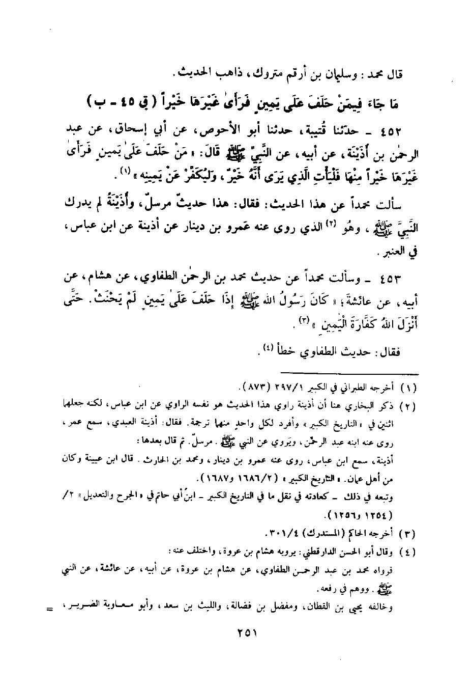 453 - وَسَأَلْتُ مُحَمَّدًا عَنْ حَدِيثِ مُحَمَّدِ بْنِ عَبْدِ الرَّحْمَنِ الطُّفَاوِيُّ , عَنْ هِشَامٍ , عَنْ أَبِيهِ , عَنْ عَائِشَةَ , كَانَ رَسُولُ اللَّهِ صَلَّى اللهُ عَلَيْهِ وَسَلَّمَ إِذَا حَلَفَ عَلَى يَمِينٍ لَمْ يَحْنَثْ حَتَّى أَنْزَلَ اللَّهُ كَفَّارَةَ الْيَمِينِ. فَقَالَ: حَدِيثُ الطُّفَاوِيِّ خَطَأٌ ,