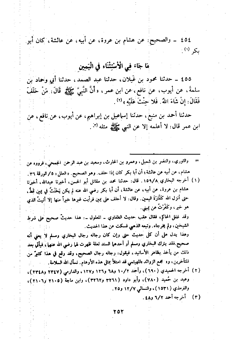 455 - حَدَّثَنَا مَحْمُودُ بْنُ غَيْلَانَ , حَدَّثَنَا عَبْدُ الصَّمَدِ , حَدَّثَنَا أَبِي وَحَمَّادُ بْنُ سَلَمَةَ , عَنْ أَيُّوبَ , عَنْ نَافِعٍ , عَنِ ابْنِ عُمَرَ , أَنَّ النَّبِيَّ صَلَّى اللهُ عَلَيْهِ وَسَلَّمَ قَالَ: " §مَنْ حَلَفَ فَقَالَ: إِنْ شَاءَ اللَّهُ , فَلَا حِنْثَ عَلَيْهِ " , حَدَّثَنَا أَحْمَدُ بْنُ مَنِيعٍ , حَدَّثَنَا إِسْمَاعِيلُ بْنُ إِبْرَاهِيمَ , عَنْ أَيُّوبَ , عَنْ نَافِعٍ , عَنِ ابْنِ عُمَرَ قَالَ: لَا أَعْلَمُهُ إِلَّا عَنِ النَّبِيِّ صَلَّى اللهُ عَلَيْهِ وَسَلَّمَ مِثْلَهُ -[253]-. سَأَلَتْ مُحَمَّدًا عَنْ هَذَا الْحَدِيثِ فَقَالَ: أَصْحَابُ نَافِعٍ رَوَوْا هَذَا الْحَدِيثَ عَنْ نَافِعٍ , عَنِ ابْنِ عُمَرَ مَوْقُوفًا إِلَّا أَيُّوبَ فَإِنَّهُ يَرْوِيهِ عَنْ نَافِعٍ , عَنِ ابْنِ عُمَرَ , عَنِ النَّبِيِّ صَلَّى اللهُ عَلَيْهِ وَسَلَّمَ وَيَقُولُونَ: إِنَّ أَيُّوبَ فِي آخِرِ أَمْرِهِ أَوْقَفَهُ