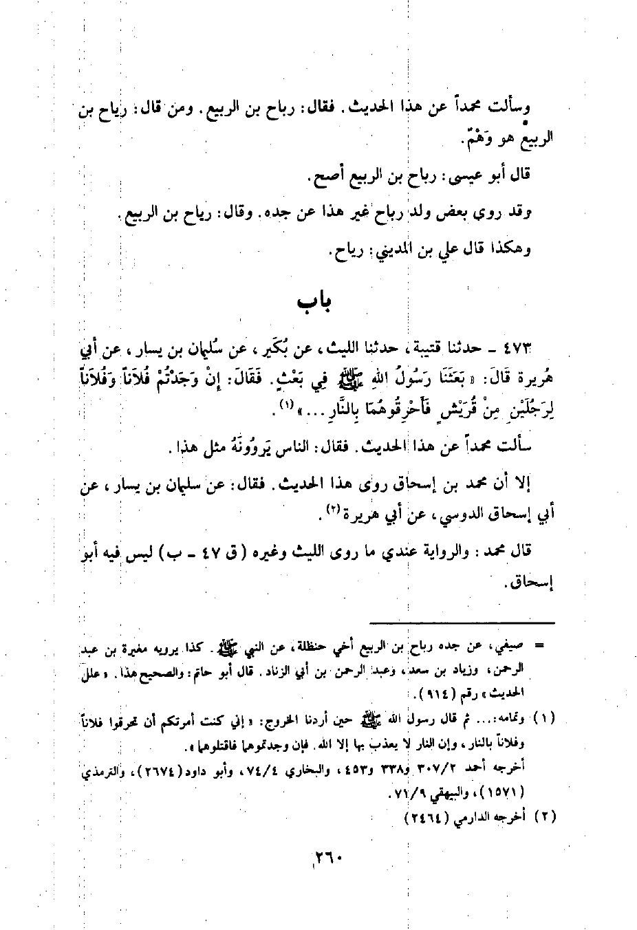 473 - حَدَّثَنَا قُتَيْبَةُ , حَدَّثَنَا اللَّيْثُ , عَنْ بُكَيْرٍ , عَنْ سُلَيْمَانَ بْنِ يَسَارٍ , عَنْ أَبِي هُرَيْرَةَ , قَالَ: بَعَثَنَا رَسُولُ اللَّهِ صَلَّى اللهُ عَلَيْهِ وَسَلَّمَ فِي بَعْثٍ فَقَالَ: «§إِنْ وَجَدْتُمْ فُلَانًا وَفُلَانًا، لِرَجُلَيْنِ مِنْ قُرَيْشٍ، فَأَحْرِقُوهُمَا بِالنَّارِ» . سَأَلْتُ مُحَمَّدًا عَنْ هَذَا الْحَدِيثِ فَقَالَ: النَّاسُ يَرْوُونَهُ مِثْلَ هَذَا إِلَّا أَنَّ مُحَمَّدَ بْنَ إِسْحَاقَ رَوَى هَذَا الْحَدِيثَ فَقَالَ: عَنْ سُلَيْمَانَ بْنِ يَسَارٍ , عَنْ أَبِي إِسْحَاقَ الدَّوْسِيِّ , عَنْ أَبِي هُرَيْرَةَ , قَالَ مُحَمَّدٌ: وَالرِّوَايَةُ عِنْدِي مَا رَوَى اللَّيْثُ وَغَيْرُهُ لَيْسَ فِيهِ أَبُو إِسْحَاقَ , -[261]- وَسُلَيْمَانُ بْنُ يَسَارٍ قَدْ سَمِعَ مِنَ أَبِي هُرَيْرَةَ ,