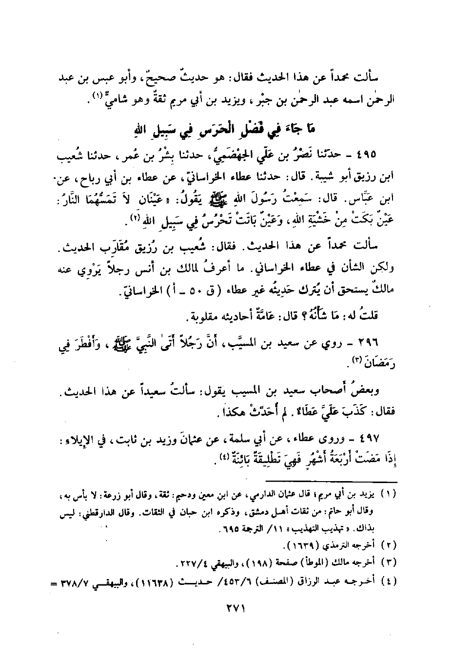 495 - حَدَّثَنَا نَصْرُ بْنُ عَلِيٍّ الْجَهْضَمِيُّ , حَدَّثَنَا بِشْرُ بْنُ عُمَرَ , حَدَّثَنَا شُعَيْبُ بْنُ رُزَيْقِ أَبُو شَيْبَةَ , قَالَ: حَدَّثَنَا عَطَاءٌ الْخُرَاسَانِيُّ , عَنْ عَطَاءِ بْنِ أَبِي رَبَاحٍ , عَنِ ابْنِ عَبَّاسٍ , قَالَ: سَمِعْتُ رَسُولَ اللَّهِ صَلَّى اللهُ عَلَيْهِ وَسَلَّمَ يَقُولُ: «§عَيْنَانِ لَا تَمَسُّهُمَا النَّارُ عَيْنٌ بَكَتْ مِنْ خَشْيَةِ اللَّهِ , وَعَيْنٌ بَاتَتْ تَحْرُسُ فِي سَبِيلِ اللَّهِ» . سَأَلْتُ مُحَمَّدًا عَنْ هَذَا الْحَدِيثِ فَقَالَ: شُعَيْبُ بْنُ رُزَيْقٍ مُقَارِبُ الْحَدِيثِ , وَلَكِنِ الشَّأْنُ فِي عَطَاءٍ الْخُرَاسَانِيِّ مَا أَعْرِفُ لِمَالِكِ بْنِ أَنَسٍ رَجُلًا يَرْوِي عَنْهُ مَالِكٌ يَسْتَحِقُّ أَنْ يُتْرَكَ حَدِيثُهُ غَيْرَ عَطَاءٍ الْخُرَاسَانِيِّ. قُلْتُ لَهُ: مَا شَأْنُهُ؟ قَالَ: عَامَّةُ أَحَادِيثِهِ مَقْلُوبَةٌ
