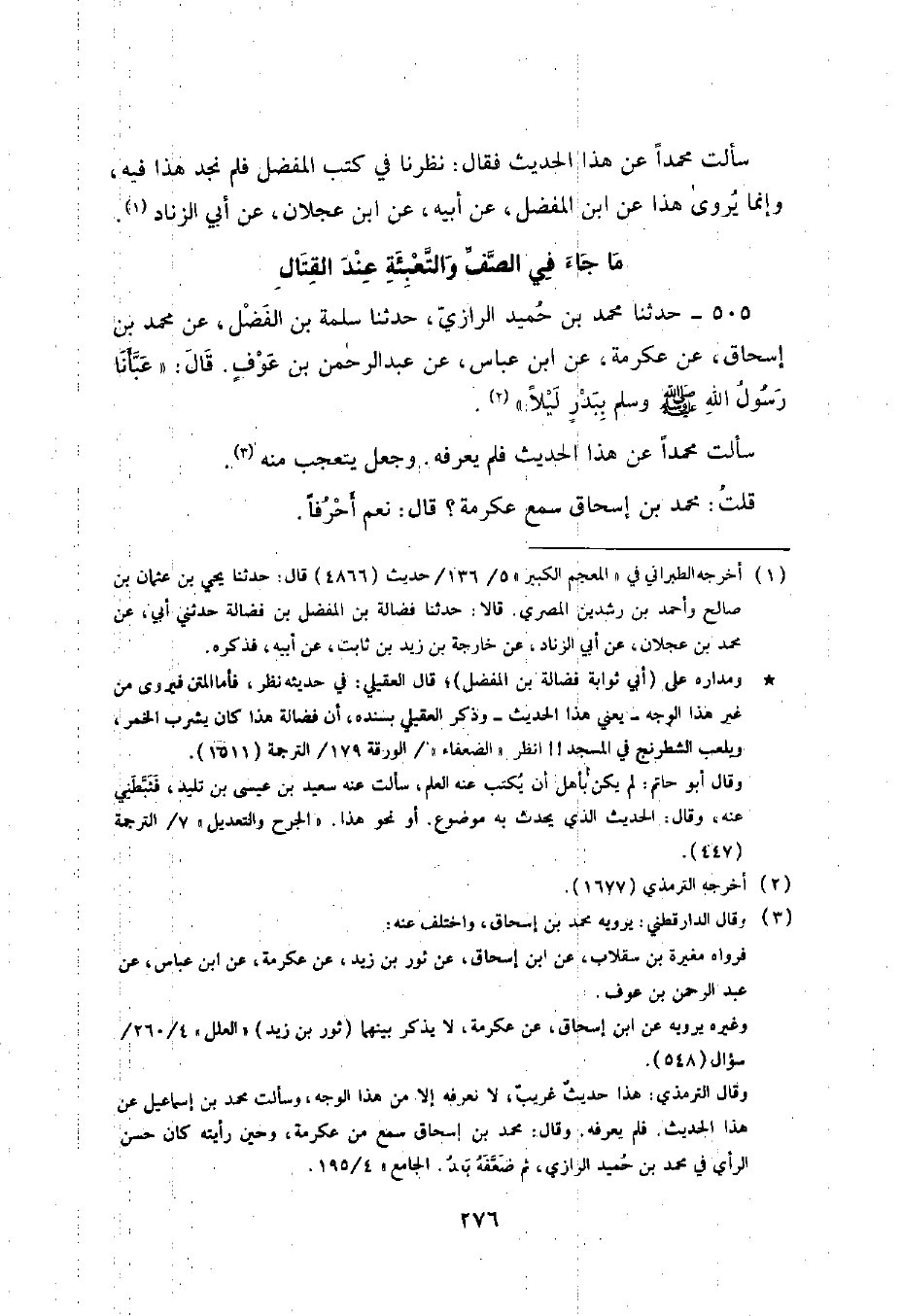 505 - حَدَّثَنَا مُحَمَّدُ بْنُ حُمَيْدٍ الرَّازِيُّ , حَدَّثَنَا سَلَمَةُ بْنُ الْفَضْلِ , عَنْ مُحَمَّدِ بْنِ إِسْحَاقَ , عَنْ عِكْرِمَةَ , عَنِ ابْنِ عَبَّاسٍ , عَنْ عَبْدِ الرَّحْمَنِ بْنِ عَوْفٍ , قَالَ: «§عَبَّأَنَا رَسُولُ اللَّهِ صَلَّى اللهُ عَلَيْهِ وَسَلَّمَ بِبَدْرٍ لَيْلًا» . سَأَلْتُ مُحَمَّدًا عَنْ هَذَا الْحَدِيثِ فَلَمْ يَعْرِفْهُ وَجَعَلَ يَتَعَجَّبُ مِنْهُ , قُلْتُ: مُحَمَّدُ بْنُ إِسْحَاقَ سَمِعَ عِكْرِمَةَ؟ قَالَ: نَعَمْ أَحْرُفًا