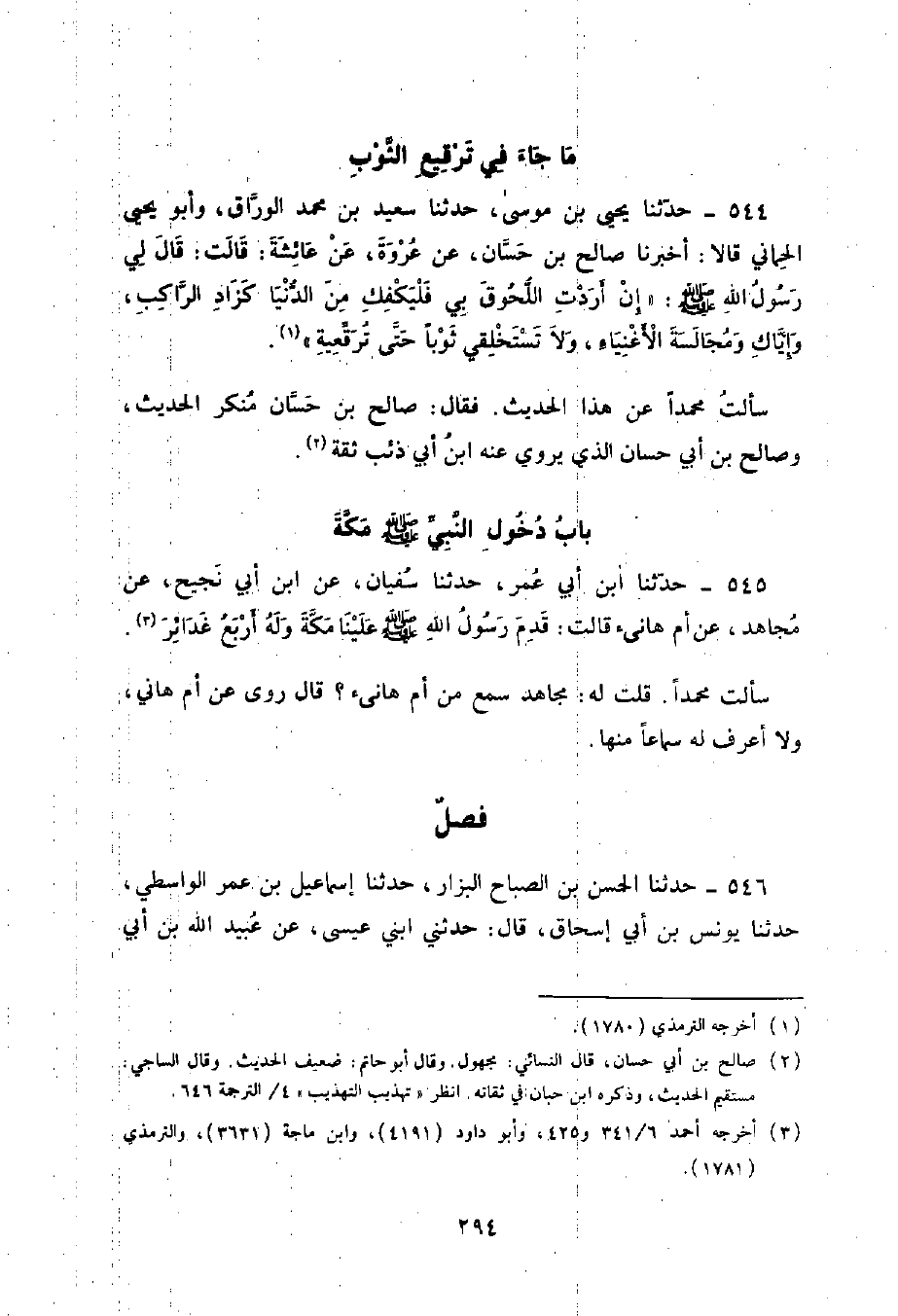 544 - حَدَّثَنَا يَحْيَى بْنُ مُوسَى , حَدَّثَنَا سَعِيدُ بْنُ مُحَمَّدٍ الْوَرَّاقُ , وَأَبُو يَحْيَى الْحِمَّانِيُّ قَالَا: أَخْبَرَنَا صَالِحُ بْنُ حَسَّانَ , عَنْ عُرْوَةَ , عَنْ عَائِشَةَ، قَالَتْ: قَالَ لِي رَسُولُ اللَّهِ صَلَّى اللهُ عَلَيْهِ وَسَلَّمَ: «§إِنْ أَرَدْتِ اللُّحُوقَ بِي فَلْيَكْفِكِ مِنَ الدُّنْيَا كَزَادِ الرَّاكِبِ , وَإِيَّاكِ وَمُجَالَسَةَ الْأَغْنِيَاءِ , وَلَا تَسْتَخْلِقِي ثَوْبًا حَتَّى تُرَقِّعِيهِ» , سَأَلْتُ مُحَمَّدًا عَنْ هَذَا الْحَدِيثِ فَقَالَ: صَالِحُ بْنُ حَسَّانَ مُنْكَرُ الْحَدِيثِ , وَصَالِحُ بْنُ أَبِي حَسَّانَ الَّذِي يَرْوِي عَنْهُ ابْنُ أَبِي ذِئْبٍ ثِقَةٌ
