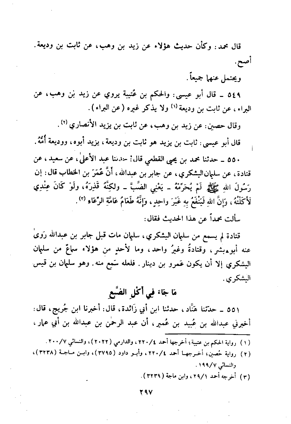 551 - حَدَّثَنَا هَنَّادٌ , حَدَّثَنَا ابْنُ أَبِي زَائِدَةَ , قَالَ: أَخْبَرَنَا ابْنُ جُرَيْجٍ , قَالَ: أَخْبَرَنِي عَبْدُ اللَّهِ بْنُ عُبَيْدِ بْنِ عُمَيْرٍ , أَنَّ عَبْدَ الرَّحْمَنِ بْنَ عَبْدِ اللَّهِ بْنِ أَبِي عَمَّارٍ , أَخْبَرَهُ قَالَ: سَأَلْتُ جَابِرَ بْنَ عَبْدِ اللَّهِ عَنِ §الضَّبُعِ آكُلُهَا؟ قَالَ: نَعَمْ. قُلْتُ: أَصَيْدٌ هِيَ؟ قَالَ: نَعَمْ. قُلْتُ: أَسَمِعْتَ ذَلِكَ مِنْ رَسُولِ اللَّهِ صَلَّى اللهُ عَلَيْهِ وَسَلَّمَ؟ قَالَ: نَعَمْ , سَالَتُ مُحَمَّدًا عَنْ هَذَا الْحَدِيثِ فَقَالَ: هُوَ حَدِيثٌ صَحِيحٌ