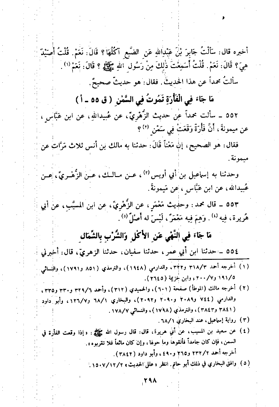 552 - سَأَلْتُ مُحَمَّدًا عَنْ حَدِيثِ الزُّهْرِيِّ , عَنْ عُبَيْدِ اللَّهِ , عَنِ ابْنِ عَبَّاسٍ , عَنْ مَيْمُونَةَ , أَنَّ فَأْرَةَ وَقَعَتْ فِي سَمْنٍ فَقَالَ: هُوَ الصَّحِيحُ إِنَّ مَعَنًا قَالَ: حَدَّثَنَا بِهِ مَالِكُ بْنُ أَنَسٍ ثَلَاثَ مَرَّاتٍ عَنْ مَيْمُونَةَ. وَحَدَّثَنَا بِهِ إِسْمَاعِيلُ بْنُ أَبِي أُوَيْسٍ عَنْ مَالِكٍ , عَنِ الزُّهْرِيِّ , عَنْ عُبَيْدِ اللَّهِ عَنِ ابْنِ عَبَّاسٍ عَنْ مَيْمُونَةَ ,