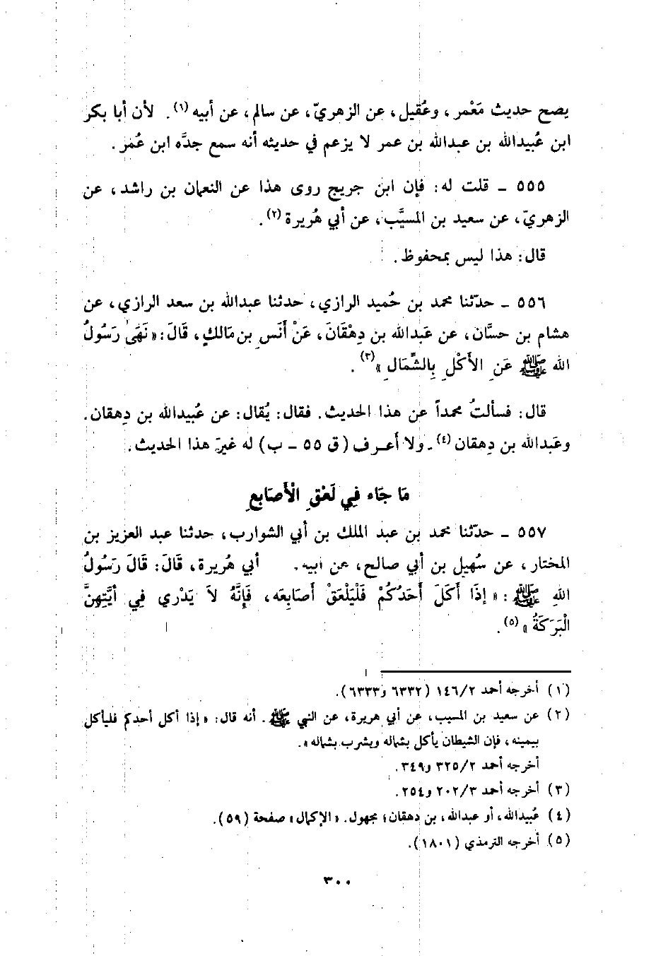 556 - حَدَّثَنَا مُحَمَّدُ بْنُ حُمَيْدٍ الرَّازِيُّ , حَدَّثَنَا عَبْدُ اللَّهِ بْنُ سَعْدٍ الرَّازِيُّ , عَنْ هِشَامِ بْنِ حَسَّانَ , عَنْ عَبْدِ اللَّهِ بْنِ دِهْقَانَ , عَنْ أَنَسِ بْنِ مَالِكٍ , قَالَ: «§نَهَى رَسُولُ اللَّهِ صَلَّى اللهُ عَلَيْهِ وَسَلَّمَ عَنِ الْأَكْلِ بِالشِّمَالِ» , قَالَ: فَسَأَلْتُ مُحَمَّدًا عَنْ هَذَا الْحَدِيثِ فَقَالَ: يُقَالُ: عَنْ عُبَيْدِ اللَّهِ بْنِ دِهْقَانَ وَعَبْدِ اللَّهِ بْنِ دَهْقَانَ، وَلَا أَعْرِفُ لَهُ غَيْرَ هَذَا الْحَدِيثِ