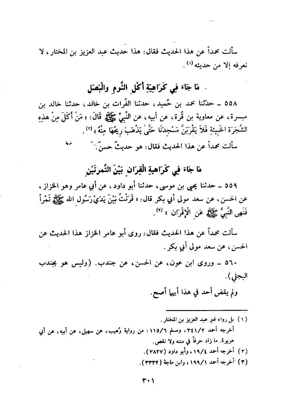 559 - حَدَّثَنَا يَحْيَى بْنُ مُوسَى , حَدَّثَنَا أَبُو دَاوُدَ , عَنْ أَبِي عَامِرٍ وَهُوَ الْخَزَّازُ , عَنِ الْحَسَنِ , عَنْ سَعْدٍ مَوْلَى أَبِي بَكْرٍ قَالَ: §قَرَنْتُ بَيْنَ يَدَيْ رَسُولِ اللَّهِ صَلَّى اللهُ عَلَيْهِ وَسَلَّمَ تَمْرًا فَنَهَى النَّبِيُّ صَلَّى اللهُ عَلَيْهِ وَسَلَّمَ عَنِ الْإِقْرَانِ " , سَأَلْتُ مُحَمَّدًا عَنْ هَذَا الْحَدِيثِ فَقَالَ: رَوَى أَبُو عَامِرٍ الْخَزَّازُ هَذَا الْحَدِيثَ عَنِ الْحَسَنِ عَنْ سَعْدٍ مَوْلَى أَبِي بَكْرٍ ,