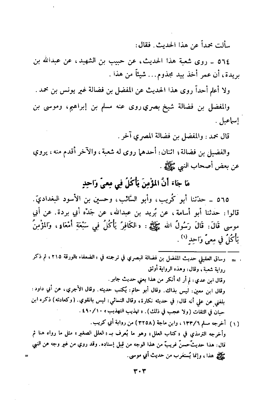 565 - حَدَّثَنَا أَبُو كُرَيْبٍ , وَأَبُو السَّائِبِ , وَحُسَيْنُ بْنُ الْأَسْوَدِ الْبَغْدَادِيُّ , قَالُوا: حَدَّثَنَا أَبُو أُسَامَةَ , عَنْ بُرَيْدِ بْنِ عَبْدِ اللَّهِ , عَنْ جَدِّهِ أَبِي بُرْدَةَ , عَنْ أَبِي مُوسَى , قَالَ: قَالَ رَسُولُ اللَّهِ صَلَّى اللهُ عَلَيْهِ وَسَلَّمَ: «§الْكَافِرُ يَأْكُلُ فِي سَبْعَةِ أَمْعَاءٍ وَالْمُؤْمِنُ يَأْكُلُ فِي مِعًى وَاحِدٍ» , سَأَلْتُ مُحَمَّدًا قَالَ: هَذَا حَدِيثُ أَبِي كُرَيْبٍ. فَقُلْتُ لَهُ: حَدَّثَنَا غَيْرُ وَاحِدٍ عَنْ أَبِي أُسَامَةَ , فَجَعَلَ يَتَعَجَّبُ مِنْهُ , وَلَمْ يَعْرِفْهُ إِلَّا مِنْ حَدِيثِهِ