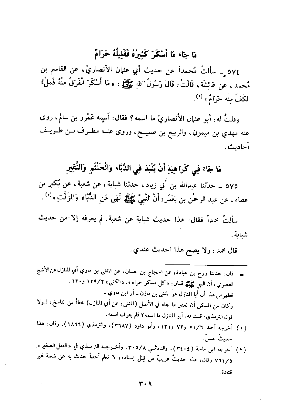 574 - سَأَلْتُ مُحَمَّدًا عَنْ حَدِيثِ أَبِي عُثْمَانَ الْأَنْصَارِيِّ , عَنِ الْقَاسِمِ بْنِ مُحَمَّدٍ , عَنْ عَائِشَةَ قَالَتْ: قَالَ رَسُولُ اللَّهِ صَلَّى اللهُ عَلَيْهِ وَسَلَّمَ: «مَا أَسْكَرَ الْفَرَقُ مِنْهُ فَمِلْءُ الْكَفِّ مِنْهُ حَرَامٌ» وَقُلْتُ لَهُ: أَبُو عُثْمَانَ الْأَنْصَارِيُّ مَا اسْمُهُ؟ فَقَالَ: اسْمُهُ عَمْرُو بْنُ سَالِمٍ. رَوَى عَنْهُ مَهْدِيُّ بْنُ مَيْمُونٍ وَالرَّبِيعُ بْنُ صَبِيحٍ , وَرَوَى عَنْهُ مُطَرِّفُ بْنُ طَرِيفٍ أَحَادِيثَ