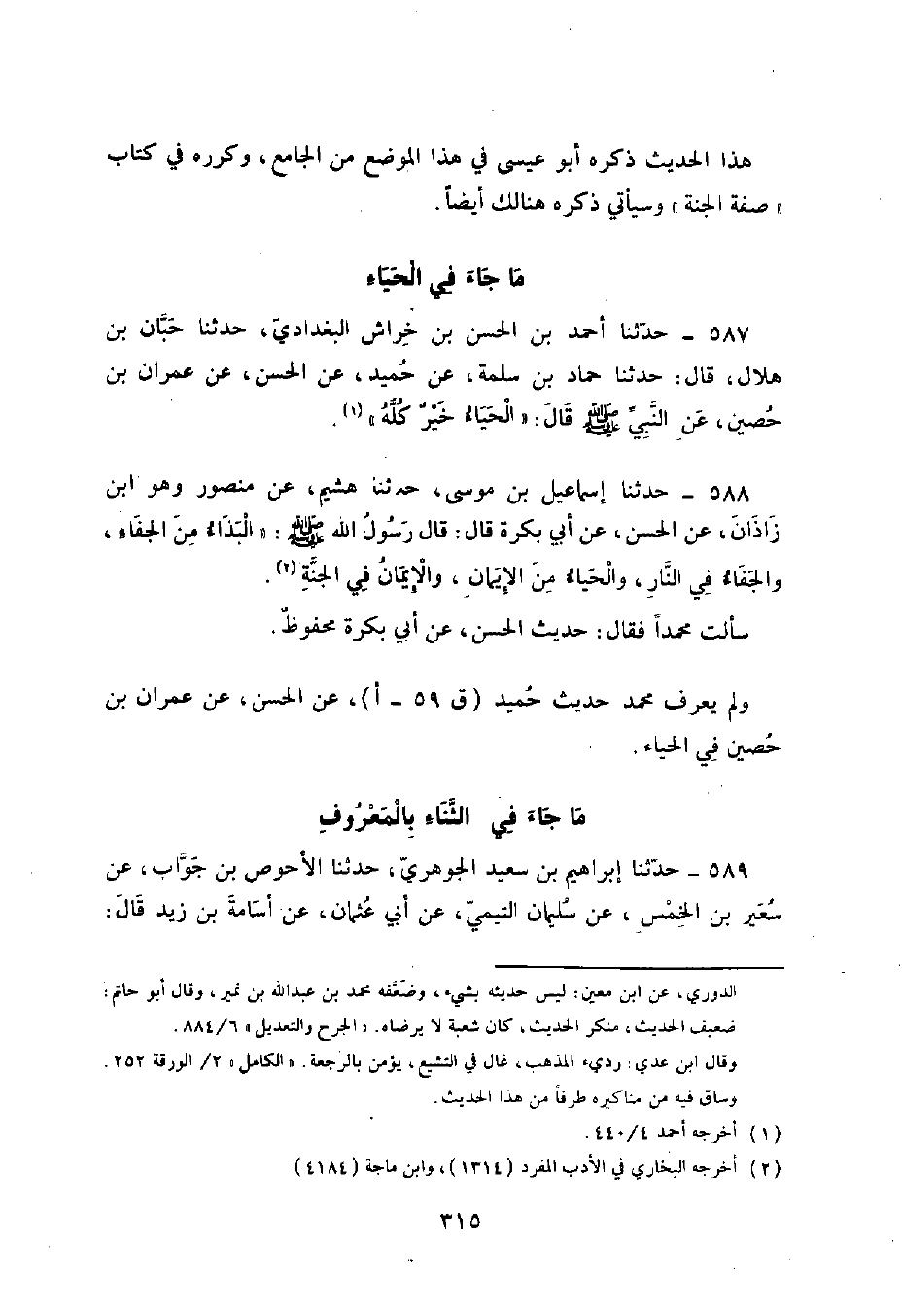 588 - حَدَّثَنَا إِسْمَاعِيلُ بْنُ مُوسَى , حَدَّثَنَا هُشَيْمٌ , عَنْ مَنْصُورٍ وَهُوَ ابْنُ زَاذَانَ , عَنِ الْحَسَنِ , عَنْ أَبِي بَكْرَةَ , قَالَ: قَالَ رَسُولُ اللَّهِ صَلَّى اللهُ عَلَيْهِ وَسَلَّمَ: «§الْبَذَاءُ مِنَ الْجَفَاءِ , وَالْجَفَاءُ فِي النَّارِ , وَالْحَيَاءُ مِنَ الْإِيمَانِ , وَالْإِيمَانُ فِي الْجَنَّةِ» سَأَلْتُ مُحَمَّدًا فَقَالَ: حَدِيثُ الْحَسَنِ عَنْ أَبِي بَكْرَةَ مَحْفُوظٌ , وَلَمْ يَعْرِفْ مُحَمَّدٌ حَدِيثَ حُمَيْدٍ عَنِ الْحَسَنِ , عَنْ عِمْرَانَ بْنِ حُصَيْنٍ فِي الْحَيَاءِ