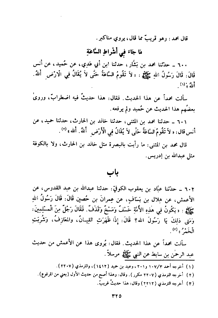 602 - حَدَّثَنَا عَبَّادُ بْنُ يَعْقُوبَ الْكُوفِيُّ , حَدَّثَنَا عَبْدُ اللَّهِ بْنُ عَبْدِ الْقُدُّوسِ , عَنِ الْأَعْمَشِ , عَنْ هِلَالِ بْنِ يَسَافٍ , عَنْ عِمْرَانَ بْنِ حُصَيْنٍ , قَالَ: قَالَ رَسُولُ اللَّهِ صَلَّى اللهُ عَلَيْهِ وَسَلَّمَ: " §يَكُونُ فِي هَذَه الْأُمَّةِ خَسْفٌ وَمَسْخٌ وَقَذْفٌ فَقَالَ رَجُلٌ مِنَ الْمُسْلِمِينَ: وَمَتَى ذَلِكَ يَا رَسُولَ اللَّهِ؟ قَالَ: إِذَا ظَهَرَتِ الْقِيَانُ وَالْمَعَازِفُ , وَشُرِبَتِ الْخَمْرُ " سَأَلْتُ مُحَمَّدًا عَنْ هَذَا الْحَدِيثِ فَقَالَ: يُرْوَى هَذَا عَنِ الْأَعْمَشِ مِنْ حَدِيثِ عَبْدِ الرَّحْمَنِ بْنِ سَابِطٍ , عَنِ النَّبِيِّ صَلَّى اللهُ عَلَيْهِ وَسَلَّمَ مُرْسَلًا. قَالَ مُحَمَّدٌ: وَعَبْدُ اللَّهِ بْنُ عَبْدِ الْقُدُّوسِ مُقَارِبُ الْحَدِيثِ