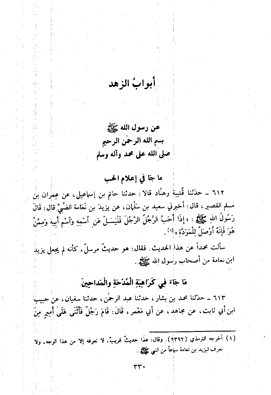 612 - حَدَّثَنَا قُتَيْبَةُ , وَهَنَّادٌ , قَالَا: حَدَّثَنَا حَاتِمُ بْنُ إِسْمَاعِيلَ , عَنْ عِمْرَانَ بْنِ مُسْلِمٍ الْقَصِيرِ , قَالَ: أَخْبَرَنِي سَعِيدُ بْنُ سَلْمَانَ , عَنْ يَزِيدَ بْنِ نَعَامَةَ الضَّبِّيِّ , قَالَ: قَالَ رَسُولُ اللَّهِ صَلَّى اللهُ عَلَيْهِ وَسَلَّمَ: «§إِذَا أَحَبَّ الرَّجُلُ الرَّجُلَ فَلْيَسَلْ عَنِ اسْمِهِ وَاسْمِ أَبِيهِ , وَمِمَّنْ هُوَ فَإِنَّهُ أَوْصَلُ لِلْمَوَدَّةِ» سَأَلْتُ مُحَمَّدًا عَنْ هَذَا الْحَدِيثِ فَقَالَ: هُوَ حَدِيثٌ مُرْسَلٌ كَأَنَّهُ لَمْ يَجْعَلْ يَزِيدَ بْنِ نَعَامَةَ مِنْ أَصْحَابِ رَسُولِ اللَّهِ صَلَّى اللهُ عَلَيْهِ وَسَلَّمَ