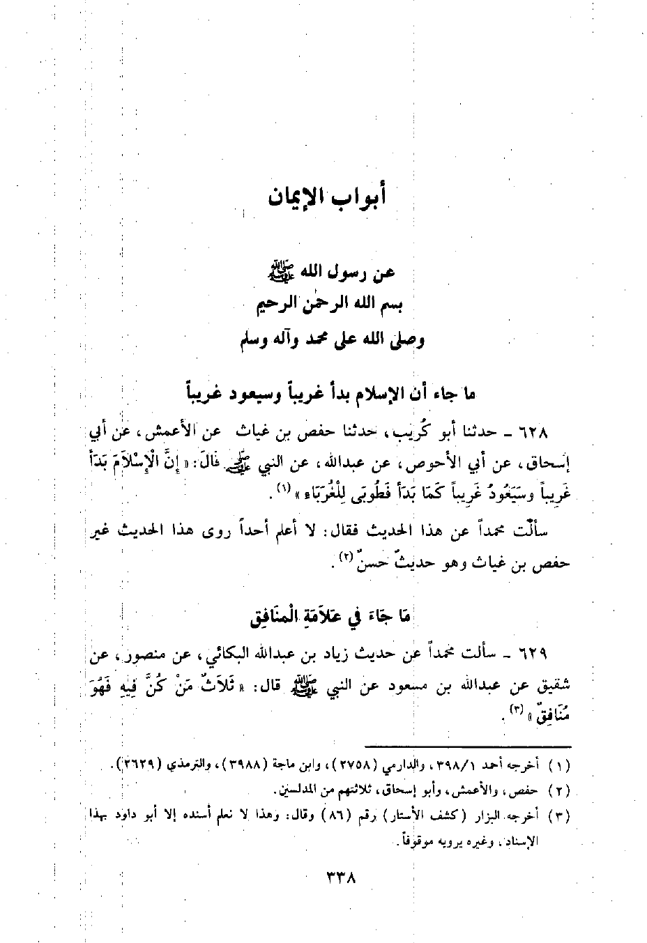 628 - حَدَّثَنَا أَبُو كُرَيْبٍ , حَدَّثَنَا حَفْصُ بْنُ غِيَاثٍ , عَنِ الْأَعْمَشِ , عَنْ أَبِي إِسْحَاقَ , عَنْ أَبِي الْأَحْوَصِ , عَنْ عَبْدِ اللَّهِ , عَنِ النَّبِيِّ صَلَّى اللهُ عَلَيْهِ وَسَلَّمَ قَالَ: «§إِنَّ الْإِسْلَامَ بَدَأَ غَرِيبًا وَسَيَعُودُ غَرِيبًا كَمَا بَدَأَ فَطُوبَى لِلْغُرَبَاءِ» سَأَلْتُ مُحَمَّدًا عَنْ هَذَا الْحَدِيثِ فَقَالَ: لَا أَعْلَمُ أَحَدًا رَوَى هَذَا الْحَدِيثَ غَيْرَ حَفْصِ بْنِ غِيَاثٍ وَهُوَ حَدِيثٌ حَسَنٌ