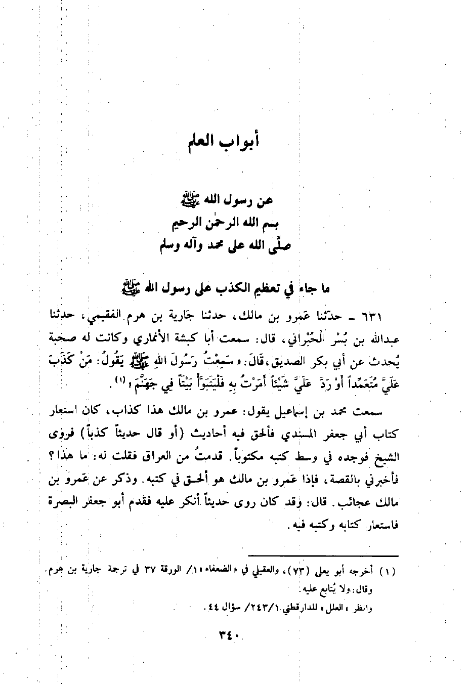 631 - حَدَّثَنَا عَمْرُو بْنُ مَالِكٍ , حَدَّثَنَا جَارِيَةُ بْنُ هَرِمٍ الْفُقَيْمِيُّ , حَدَّثَنَا عَبْدُ اللَّهِ بْنُ بُسْرٍ الْحُبْرَانِيُّ , قَالَ: سَمِعْتُ أَبَا كَبْشَةَ الْأَنْمَارِيَّ , وَكَانَتْ لَهُ صُحْبَةٌ يُحَدِّثُ عَنْ أَبِي بَكْرٍ الصِّدِّيقِ , قَالَ: سَمِعْتُ رَسُولَ اللَّهِ صَلَّى اللهُ عَلَيْهِ وَسَلَّمَ يَقُولُ: «§مَنْ كَذَبَ عَلَيَّ مُتَعَمِّدًا أَوْ رَدَّ عَلَيَّ شَيْئًا أَمَرْتُ بِهِ فَلْيَتَبَوَّأْ بَيْتًا فِي جَهَنَّمَ» سَمِعْتُ مُحَمَّدَ بْنَ إِسْمَاعِيلَ يَقُولُ: عَمْرُو بْنُ مَالِكٍ هَذَا كَذَّابٌ كَانَ اسْتَعَارَ كِتَابَ أَبِي جَعْفَرٍ الْمُسْنَدِيِّ فَأَلْحَقَ فِيهِ أَحَادِيثَ أَوْ قَالَ: حَدِيثًا كَذِبًا فَرَوَى الشَّيْخُ فَوَجَدَهُ فِي وَسَطِ كُتُبِهِ مَكْتُوبًا قَدِمْتُ مِنَ الْعِرَاقِ فَقُلْتُ لَهُ: مَا هَذَا؟ فَأَخْبَرَنِي بِالْقَصَّةِ فَإِذَا عَمْرُو بْنُ مَالِكٍ هُوَ أَلْحَقَ فِي كُتُبِهِ , وَذَكَرَ عَنْ عَمْرِو بْنِ مَالِكٍ عَجَائِبَ , قَالَ: وَقَدْ كَانَ رَوَى حَدِيثًا أَنْكَرَ عَلَيْهِ , فَقَدِمَ أَبُو جَعْفَرٍ الْبَصْرَةَ فَاسْتَعَارَ كِتَابَهُ وَكُتُبُهُ فِيهِ