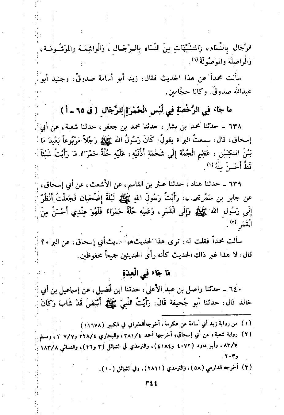 639 - حَدَّثَنَا هَنَّادٌ , حَدَّثَنَا عَبْثَرُ بْنُ الْقَاسِمِ , عَنِ الْأَشْعَثِ , عَنْ أَبِي إِسْحَاقَ , عَنْ جَابِرِ بْنِ سَمُرَةَ , قَالَ: «§رَأَيْتُ رَسُولَ اللَّهِ صَلَّى اللهُ عَلَيْهِ وَسَلَّمَ لَيْلَةَ إِضْحِيَانٍ فَجَعَلْتُ أَنْظُرُ إِلَى رَسُولِ اللَّهِ صَلَّى اللهُ عَلَيْهِ وَسَلَّمَ وَإِلَى الْقَمَرِ وَعَلَيْهِ حُلَّةٌ حَمْرَاءُ فَلَهُوَ عِنْدِي أَحْسَنُ مِنَ الْقَمَرِ» سَأَلْتُ مُحَمَّدًا فَقُلْتُ لَهُ: تَرَى هَذَا الْحَدِيثَ هُوَ حَدِيثَ أَبِي إِسْحَاقَ عَنِ الْبَرَاءِ؟ قَالَ: لَا , هَذَا غَيْرُ ذَاكَ الْحَدِيثُ كَأَنَّهُ رَأَى الْحَدِيثَيْنِ جَمِيعًا مَحْفُوظَيْنِ