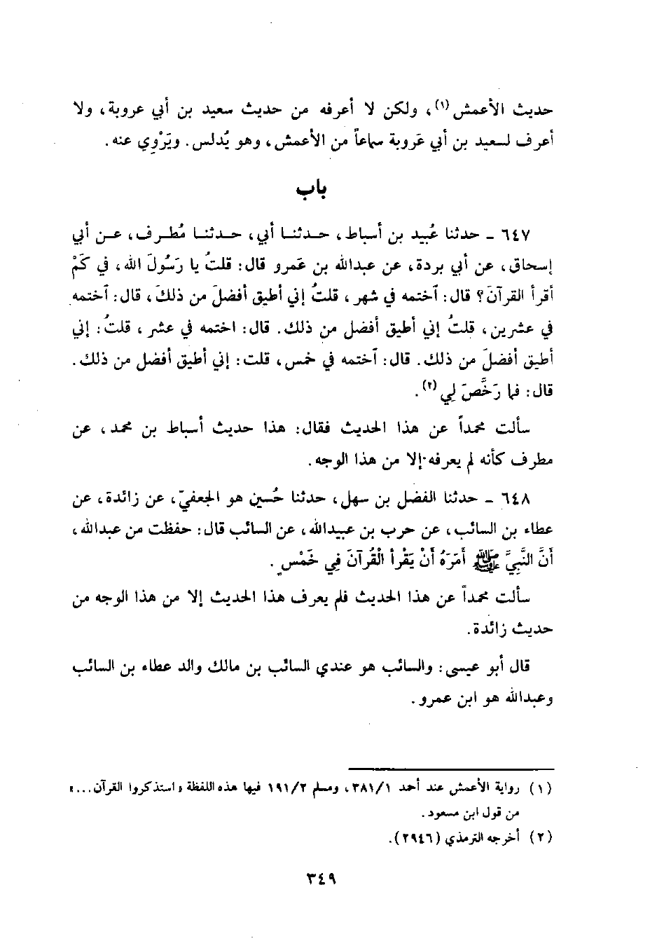648 - حَدَّثَنَا الْفَضْلُ بْنُ سَهْلٍ , حَدَّثَنَا حُسَيْنٌ هُوَ الْجُعْفِيُّ , عَنْ زَائِدَةَ , عَنْ عَطَاءِ بْنِ السَّائِبِ , عَنْ حَرْبِ بْنِ عُبَيْدِ اللَّهِ , عَنِ السَّائِبِ , قَالَ: حَفِظْتُ مِنْ عَبْدِ اللَّهِ أَنَّ النَّبِيَّ صَلَّى اللهُ عَلَيْهِ وَسَلَّمَ §أَمَرَهُ أَنْ يَقْرَأَ الْقُرْآنَ فِي خَمْسٍ " سَأَلْتُ مُحَمَّدًا عَنْ هَذَا الْحَدِيثِ فَلَمْ يَعْرِفْ هَذَا الْحَدِيثَ إِلَّا مِنْ هَذَا الْوَجْهِ مِنْ حَدِيثِ زَائِدَةَ. قَالَ أَبُو عِيسَى: وَالسَّائِبُ هُوَ عِنْدِي السَّائِبُ بْنُ مَالِكٍ وَالِدُ عَطَاءِ بْنِ السَّائِبِ , وَعَبْدُ اللَّهِ هُوَ ابْنُ عَمْرٍو