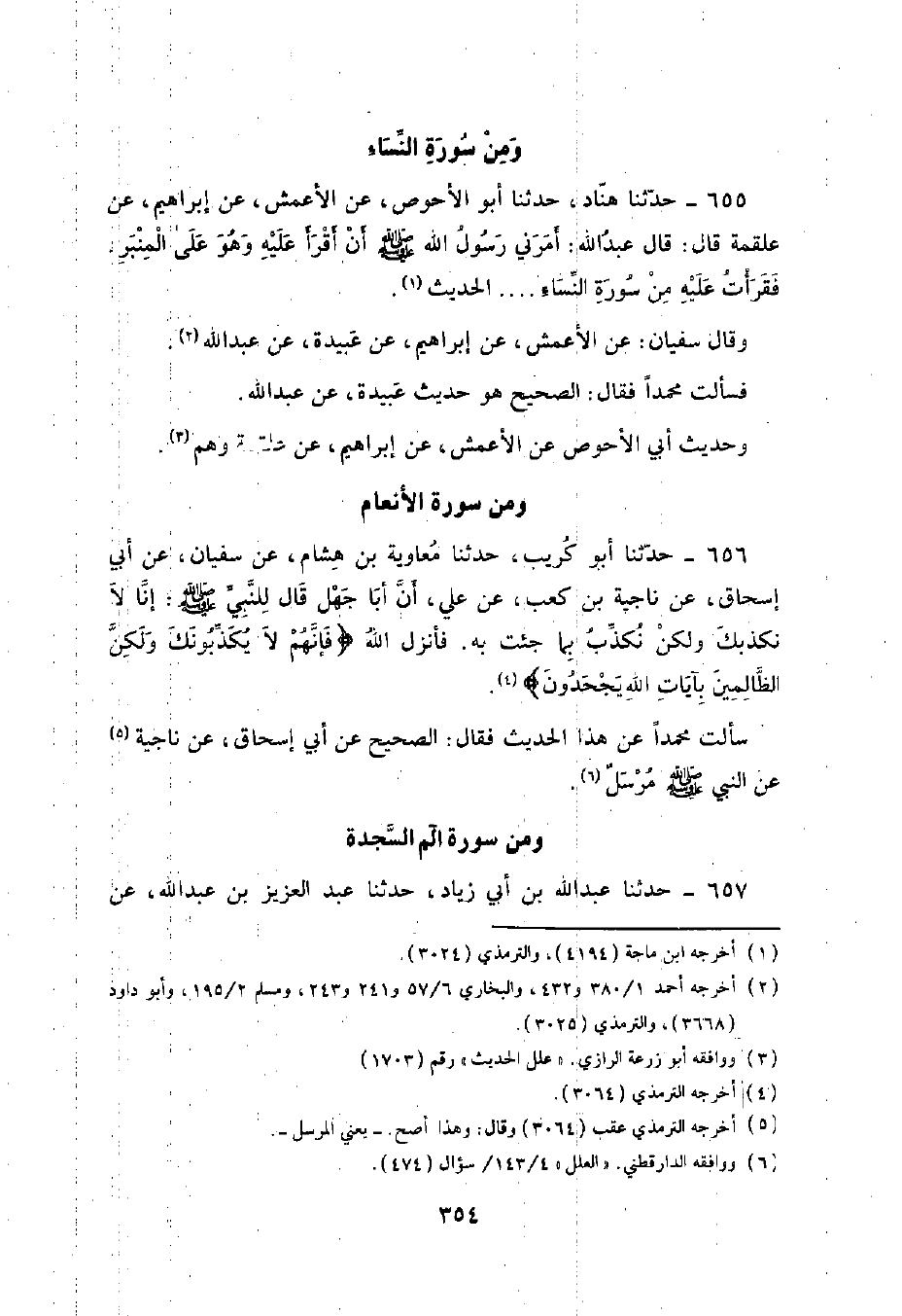 655 - حَدَّثَنَا هَنَّادٌ , حَدَّثَنَا أَبُو الْأَحْوَصِ , عَنِ الْأَعْمَشِ , عَنْ إِبْرَاهِيمَ , عَنْ عَلْقَمَةَ , قَالَ: قَالَ عَبْدُ اللَّهِ: §أَمَرَنِي رَسُولُ اللَّهِ صَلَّى اللهُ عَلَيْهِ وَسَلَّمَ أَنْ أَقْرَأَ عَلَيْهِ وَهُوَ عَلَى الْمِنْبَرِ فَقَرَأْتُ عَلَيْهِ مِنْ سُورَةَ النِّسَاءِ " الْحَدِيثَ وَقَالَ سُفْيَانُ: عَنِ الْأَعْمَشِ , عَنْ إِبْرَاهِيمَ , عَنْ عُبَيْدَةَ , عَنْ عَبْدِ اللَّهِ فَسَأَلْتُ مُحَمَّدًا فَقَالَ: الصَّحِيحُ هُوَ حَدِيثُ عَبِيدَةَ عَنْ عَبْدِ اللَّهِ , وَحَدِيثُ أَبِي الْأَحْوَصِ , عَنِ الْأَعْمَشِ , عَنْ إِبْرَاهِيمَ , عَنْ عَلْقَمَةَ وَهْمٌ