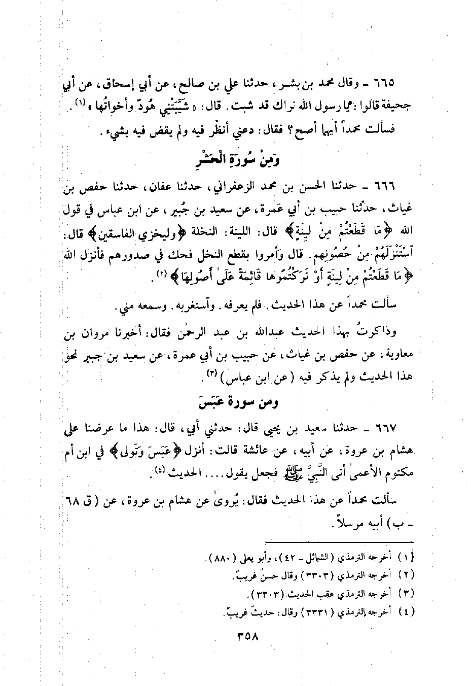 666 - حَدَّثَنَا الْحَسَنُ بْنُ مُحَمَّدٍ الزَّعْفَرَانِيُّ , حَدَّثَنَا عَفَّانُ , حَدَّثَنَا حَفْصُ بْنُ غِيَاثٍ , حَدَّثَنَا حَبِيبُ بْنُ أَبِي عَمْرَةَ , عَنْ سَعِيدِ بْنِ جُبَيْرٍ , عَنِ ابْنِ عَبَّاسٍ , " §فِي قَوْلِ اللَّهِ {مَا قَطَعْتُمْ مِنْ لِينَةٍ} [الحشر: 5] قَالَ: اللِّينَةُ النَّخْلَةُ. {وَلِيُخْزِيَ الْفَاسِقِينَ} [الحشر: 5] قَالَ: اسْتَنْزَلَهُمْ مِنْ حُصُونِهِمْ. قَالَ: وَأُمِرُوا بِقَطْعِ النَّخْلِ فَحَكَّ فِي صُدُورِهِمْ فَأَنْزَلَ اللَّهُ {مَا قَطَعْتُمْ مِنْ لِينَةٍ أَوْ تَرَكْتُمُوهَا قَائِمَةً عَلَى أُصُولِهَا} [الحشر: 5] " سَأَلْتُ مُحَمَّدًا عَنْ هَذَا الْحَدِيثِ فَلَمْ يَعْرِفْهُ وَاسْتَغْرَبَهُ وَسَمِعَهُ مِنِّي. وَذَاكَرْتُ بِهَذَا الْحَدِيثِ عَبْدَ اللَّهِ بْنَ عَبْدِ الرَّحْمَنِ فَقَالَ: أَخْبَرَنَا مَرْوَانُ بْنُ مُعَاوِيَةَ , عَنْ حَفْصِ بْنِ غِيَاثٍ , عَنْ حَبِيبِ بْنِ أَبِي عَمْرَةَ , عَنْ سَعِيدِ بْنِ جُبَيْرٍ نَحْوَ هَذَا الْحَدِيثِ وَلَمْ يَذْكُرْ فِيهِ: عَنِ ابْنِ عَبَّاسٍ