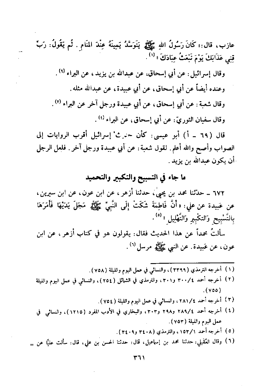 672 - حَدَّثَنَا مُحَمَّدُ بْنُ يَحْيَى , حَدَّثَنَا أَزْهَرُ , عَنِ ابْنِ عَوْنٍ , عَنِ ابْنِ سِيرِينَ , عَنْ عَبِيدَةَ , عَنْ عَلِيٍّ , أَنَّ فَاطِمَةَ , §شَكَتْ إِلَى النَّبِيِّ صَلَّى اللهُ عَلَيْهِ وَسَلَّمَ مَجْلَ يَدَيْهَا فَأَمَرَهَا بِالتَّسْبِيحِ وَالتَّكْبِيرِ وَالتَّهْلِيلِ " سَأَلْتُ مُحَمَّدًا عَنْ هَذَا الْحَدِيثِ فَقَالَ: يَقُولُونَ هُوَ فِي كِتَابِ أَزْهَرَ , عَنِ ابْنِ عَوْنٍ , عَنْ عُبَيْدَةَ , عَنِ النَّبِيِّ صَلَّى اللهُ عَلَيْهِ وَسَلَّمَ مُرْسَلٌ