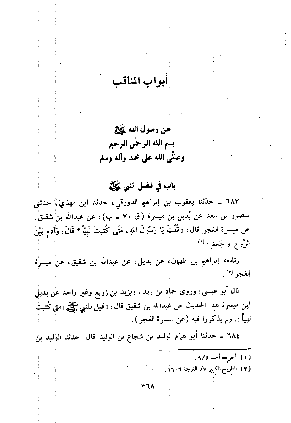 683 - حَدَّثَنَا يَعْقُوبُ بْنُ إِبْرَاهِيمَ الدَّوْرَقِيُّ , حَدَّثَنَا ابْنُ مَهْدِيٍّ , حَدَّثَنِي مَنْصُورُ بْنُ سَعْدٍ , عَنْ بُدَيْلِ بْنِ مَيْسَرَةَ , عَنْ عَبْدِ اللَّهِ بْنِ شَقِيقٍ , عَنْ مَيْسَرَةَ الْفَجْرِ , قَالَ: §قُلْتُ: يَا رَسُولَ اللَّهِ مَتَى كُتِبَتْ نَبِيًّا؟ قَالَ: «وَآدَمُ بَيْنَ الرُّوحِ وَالْجَسَدِ» وَتَابَعَهُ إِبْرَاهِيمُ بْنُ طَهْمَانَ عَنْ بُدَيْلٍ , عَنْ عَبْدِ اللَّهِ بْنِ شَقِيقٍ , عَنْ مَيْسَرَةَ الْفَجْرِ قَالَ أَبُو عِيسَى: وَرَوَى حَمَّادُ بْنُ زَيْدٍ , وَيَزِيدُ بْنُ زُرَيْعٍ وَغَيْرُ وَاحِدٍ عَنْ بُدَيْلِ بْنِ مَيْسَرَةَ هَذَا الْحَدِيثَ , عَنْ عَبْدِ اللَّهِ بْنِ شَقِيقٍ قَالَ: قِيلَ لِلنَّبِيِّ صَلَّى اللهُ عَلَيْهِ وَسَلَّمَ: مَتَى كُتِبَتْ نَبِيًّا؟ . وَلَمْ يَذْكُرُوا فِيهِ عَنْ مَيْسَرَةَ الْفَجْرِ