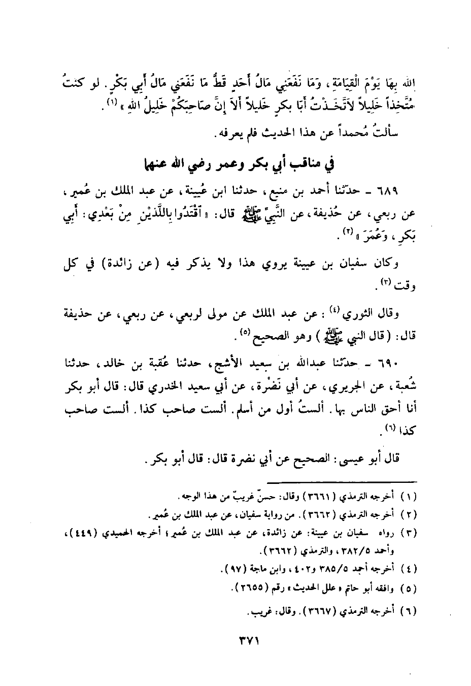 689 - حَدَّثَنَا أَحْمَدُ بْنُ مَنِيعٍ , حَدَّثَنَا ابْنُ عُيَيْنَةَ , عَنْ عَبْدِ الْمَلِكِ بْنِ عُمَيْرٍ , عَنْ رِبْعِيٍّ , عَنْ حُذَيْفَةَ , عَنِ النَّبِيِّ صَلَّى اللهُ عَلَيْهِ وَسَلَّمَ قَالَ: «§اقْتَدُوا بِاللَّذَيْنِ مِنْ بَعْدِي أَبِي بَكْرٍ وَعُمَرَ» وَكَانَ سُفْيَانُ بْنُ عُيَيْنَةَ يَرْوِي هَذَا وَلَا يَذْكُرُ فِيهِ: عَنْ زَائِدَةَ فِي كُلِّ وَقْتٍ. وَقَالَ الثَّوْرِيُّ: عَنْ عَبْدِ الْمَلِكِ , عَنْ مَوْلًى لِرِبْعِيٍّ , عَنْ رِبْعِيٍّ , عَنْ حُذَيْفَةَ قَالَ: قَالَ النَّبِيُّ صَلَّى اللهُ عَلَيْهِ وَسَلَّمَ وَهُوَ الصَّحِيحُ